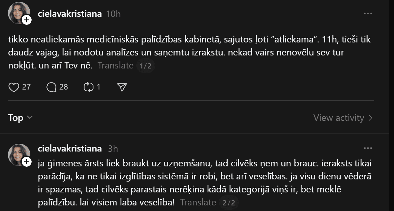 “Tikko neatliekamās medicīniskās palīdzības kabinetā sajutos ļoti “atliekama”. 11 h – tieši tik daudz vajag, lai nodotu analīzes un saņemtu izrakstu. Nekad vairs nenovēlu sev tur nokļūt, un arī Tev nē. Ja ģimenes ārsts liek braukt uz uzņemšanu, tad cilvēks ņem un brauc. Ieraksts tikai parādīja, ka ne tikai izglītības sistēmā ir robi, bet arī veselības. Ja visu dienu vēderā ir spazmas, tad cilvēks parastais nerēķina, kādā kategorijā viņš ir, bet meklē palīdzību. Lai visiem laba veselība!” vietnē “Threads” dalās Kristiāna.