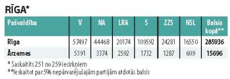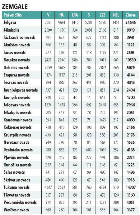 Saīsinājumi: V – “Vienotība”, NA – Nacionālā apvienība, LRA – Latvijas Reģionu apvienība, S – “Saskaņa”, ZZS – Zaļo un zemnieku savienība, NSL – “No sirds Latvijai”.
