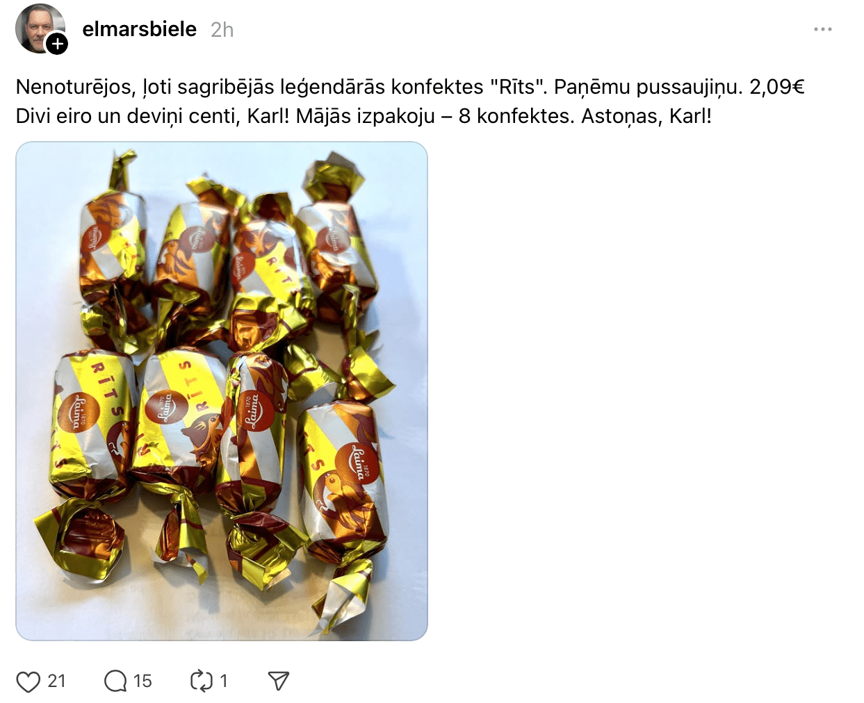 “Nenoturējos, ļoti sagribējās leģendārās konfektes “Rīts”. Paņēmu pussaujiņu – 2,09 eiro. Divi eiro un deviņi centi! Mājās izpakoju – 8 konfektes. Astoņas!” vietnē “Threads” raksta Elmārs.