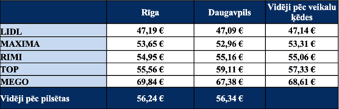 Pētījuma dienā vidējā groza cena Rīgā bija par 10 eirocentiem zemāka nekā Daugavpilī. Turklāt šomēnes cenas produktiem Rīgā un Daugavpilī atšķīrās gandrīz visās veikalu ķēdēs, izņemot “Maxima”. Lielākā produktu groza cenas atšķirība dažādās pilsētās vienā veikalu ķēdē bija “Top” veikalos Rīgā un Daugavpilī, kur identisku produktu groza cena atšķīrās par 3,55 eiro. “Mego” šī cenu atšķirība bija 2,46 eiro.