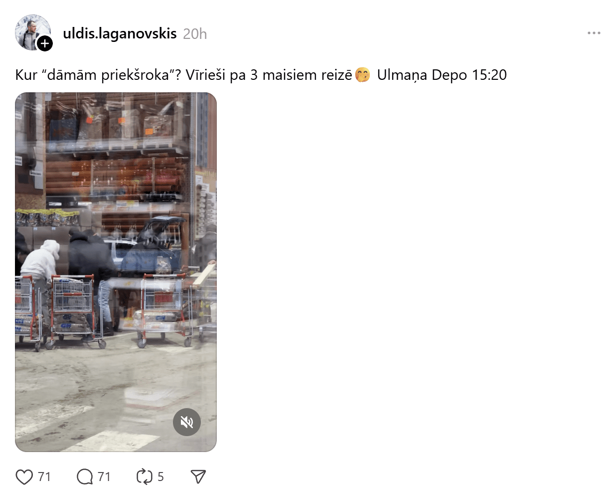 Ar video “Threads” dalījies Uldis, pie ieraksta ironiski vaicājot: “Kur dāmām priekšroka? Vīrieši pa 3 maisiem reizē.”