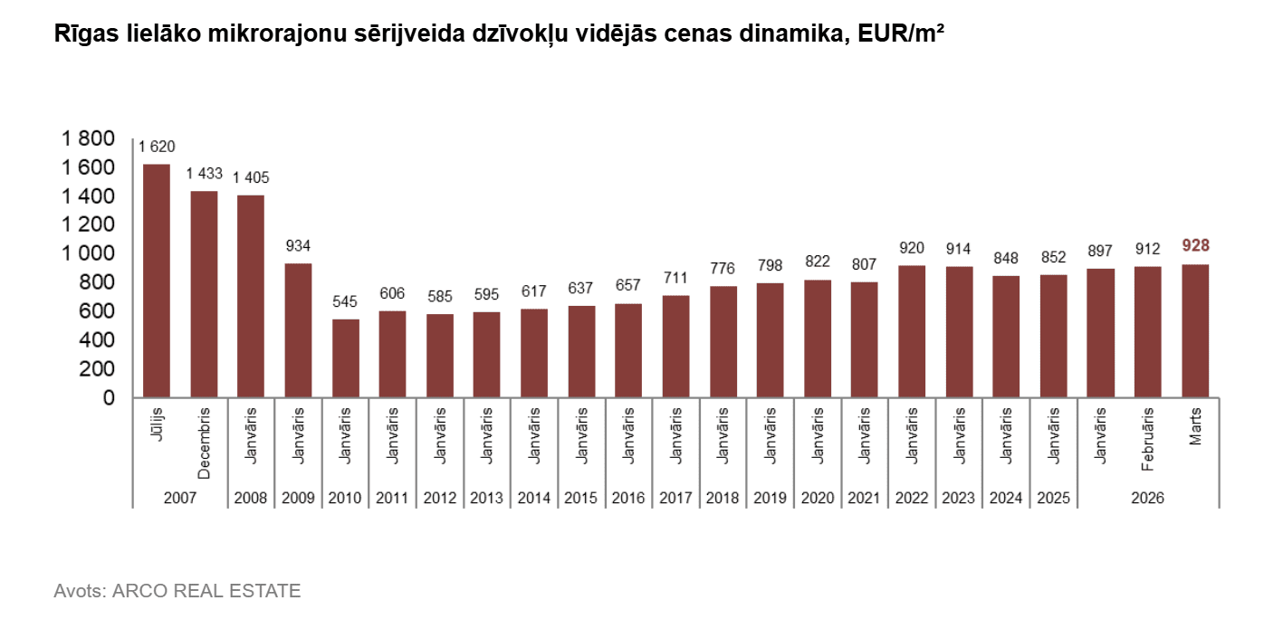 Martā sērijveida dzīvokļu vidējā cena Rīgā bija 928 eiro par kvadrātmetru. Cena bija par vidēji 43% zemāka nekā 2007. gada 1. jūlijā, kad neremontēta sērijveida dzīvokļa vidējā cena sasniedza visu laiku augstāko atzīmi – 1620 eiro par kvadrātmetru.