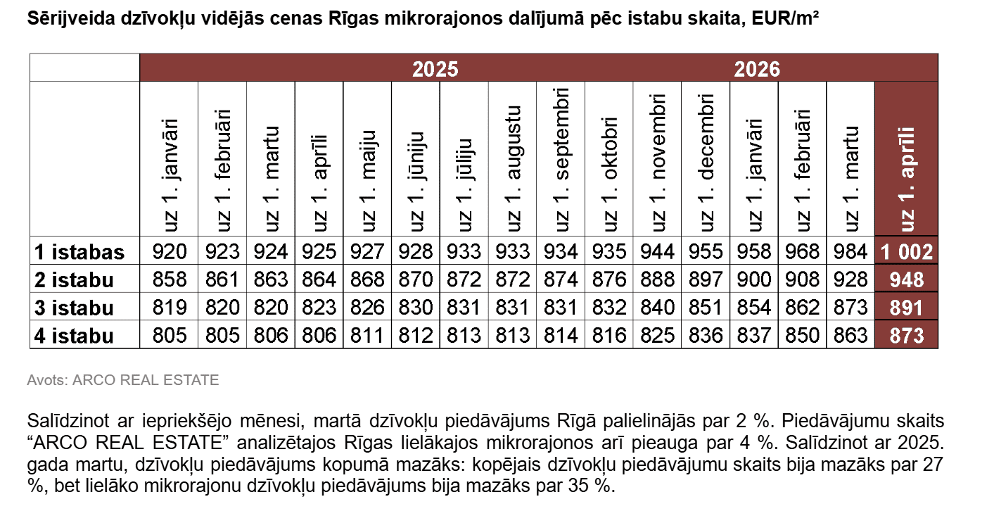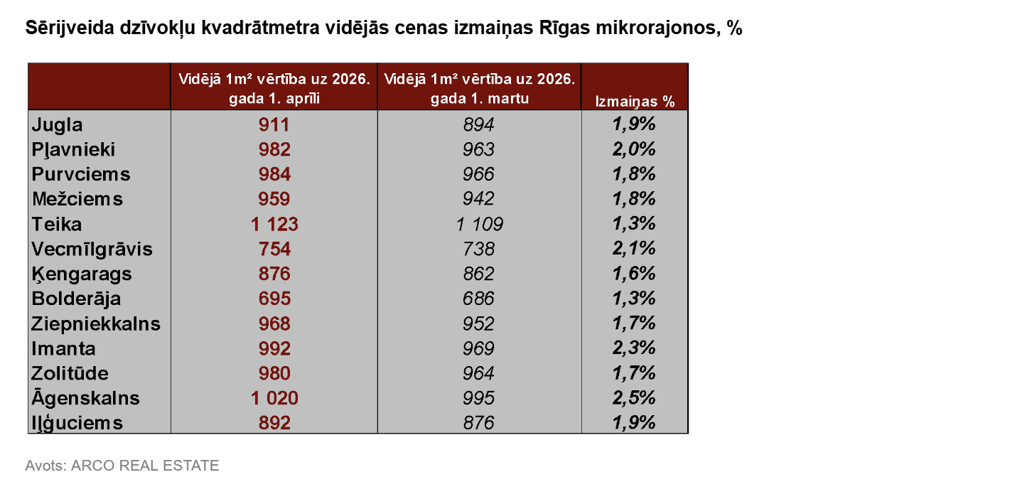 “Arco Real Estate” pārskatā atzīmēts, ka cenas pieaugums šogad ir lielāks nekā visā iepriekšējā gadā kopumā. Par cenu palielinājuma iemeslu joprojām var uzskatīt dzīvokļu nepietiekamo piedāvājumu visos Rīgas mikrorajonos. Tāpat kompānijā atzīmē, ka martā sērijveida dzīvokļu vidējās cenas pieaugums bija augstākais pēdējo gadu laikā.