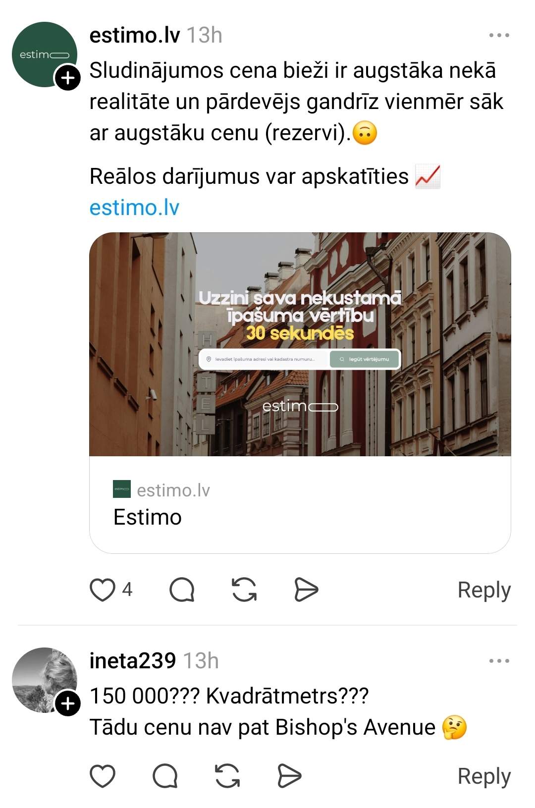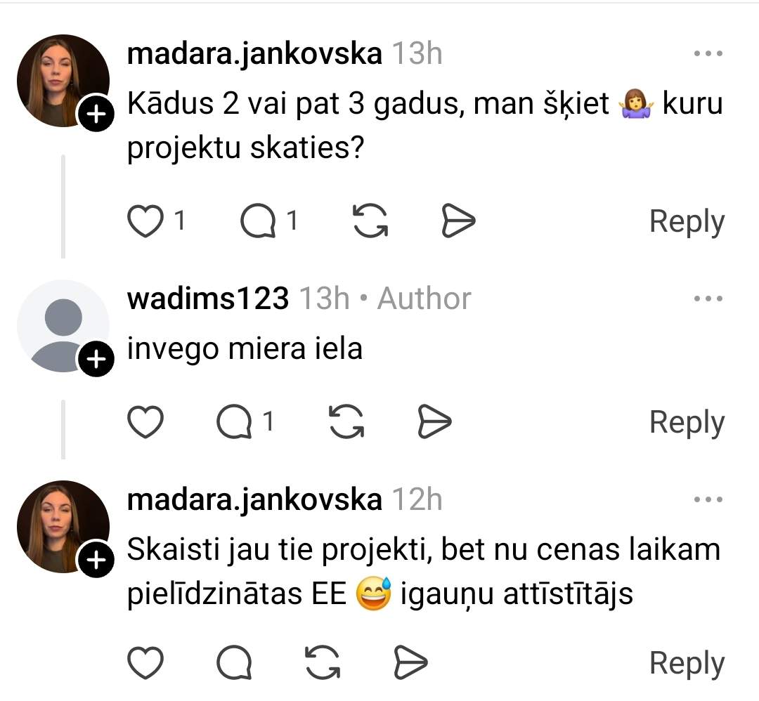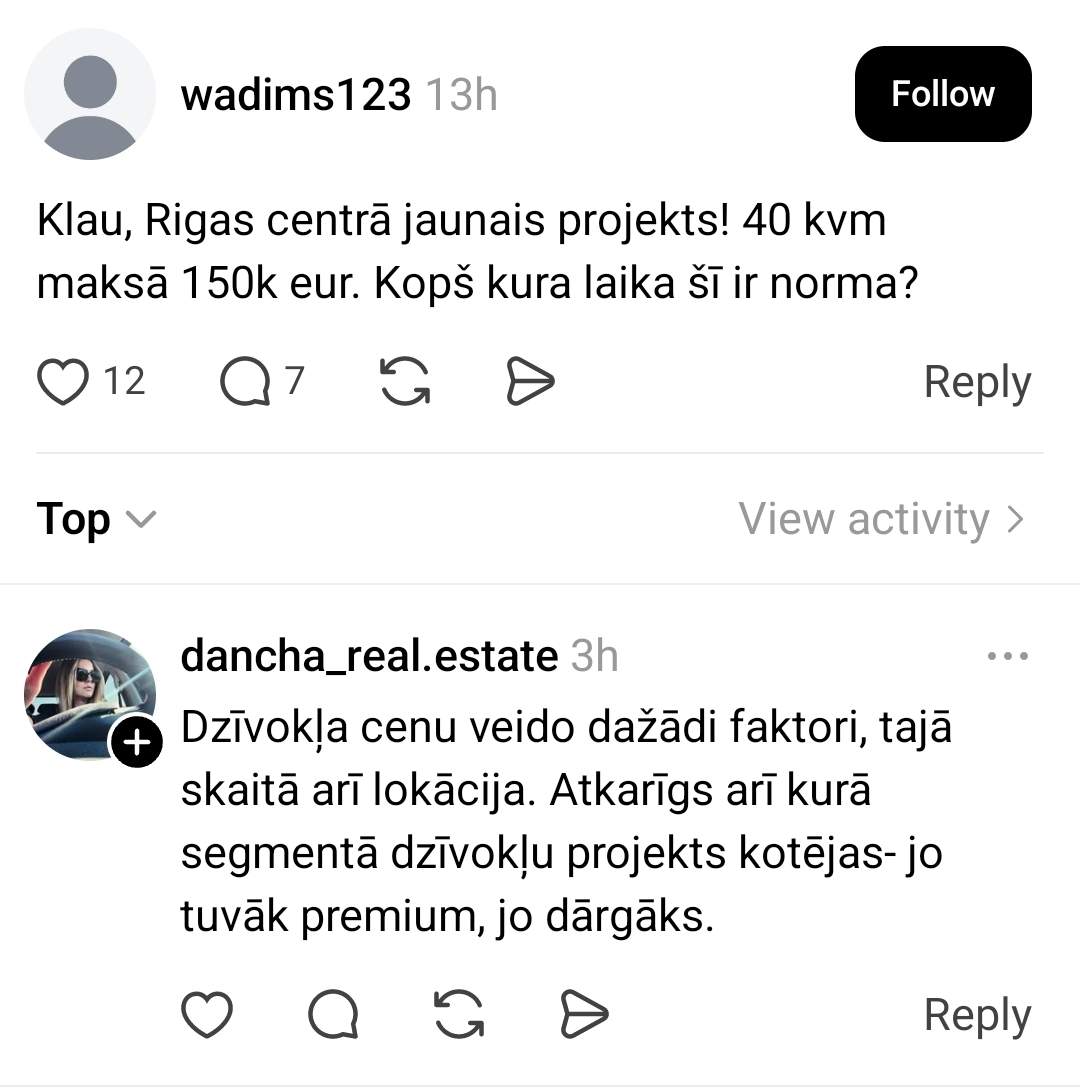 Autors arī precizē, ka runa ir par projektu Miera ielā, ko attīsta igauņu uzņēmums. Tas savukārt liek dažiem komentētājiem secināt, ka cenas Latvijā pamazām pielīdzinās kaimiņvalstu līmenim, īpaši ja runa ir par jauniem, premium segmentam tuvākiem projektiem.