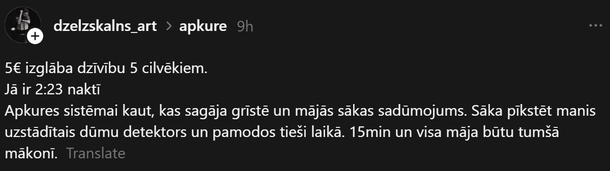 “5 eiro izglāba dzīvību 5 cilvēkiem. Jā, ir 2:23 naktī. Apkures sistēmai kaut kas sagāja grīstē, un mājās sākās sadūmojums. Sāka pīkstēt manis uzstādītais dūmu detektors, un pamodos tieši laikā. 15 minūtes, un visa māja būtu tumšā mākonī,” vietnē “Threads” dalījies Artis.