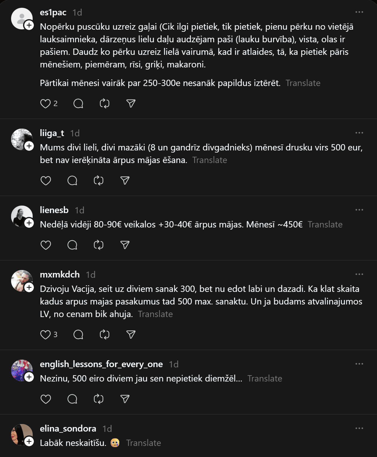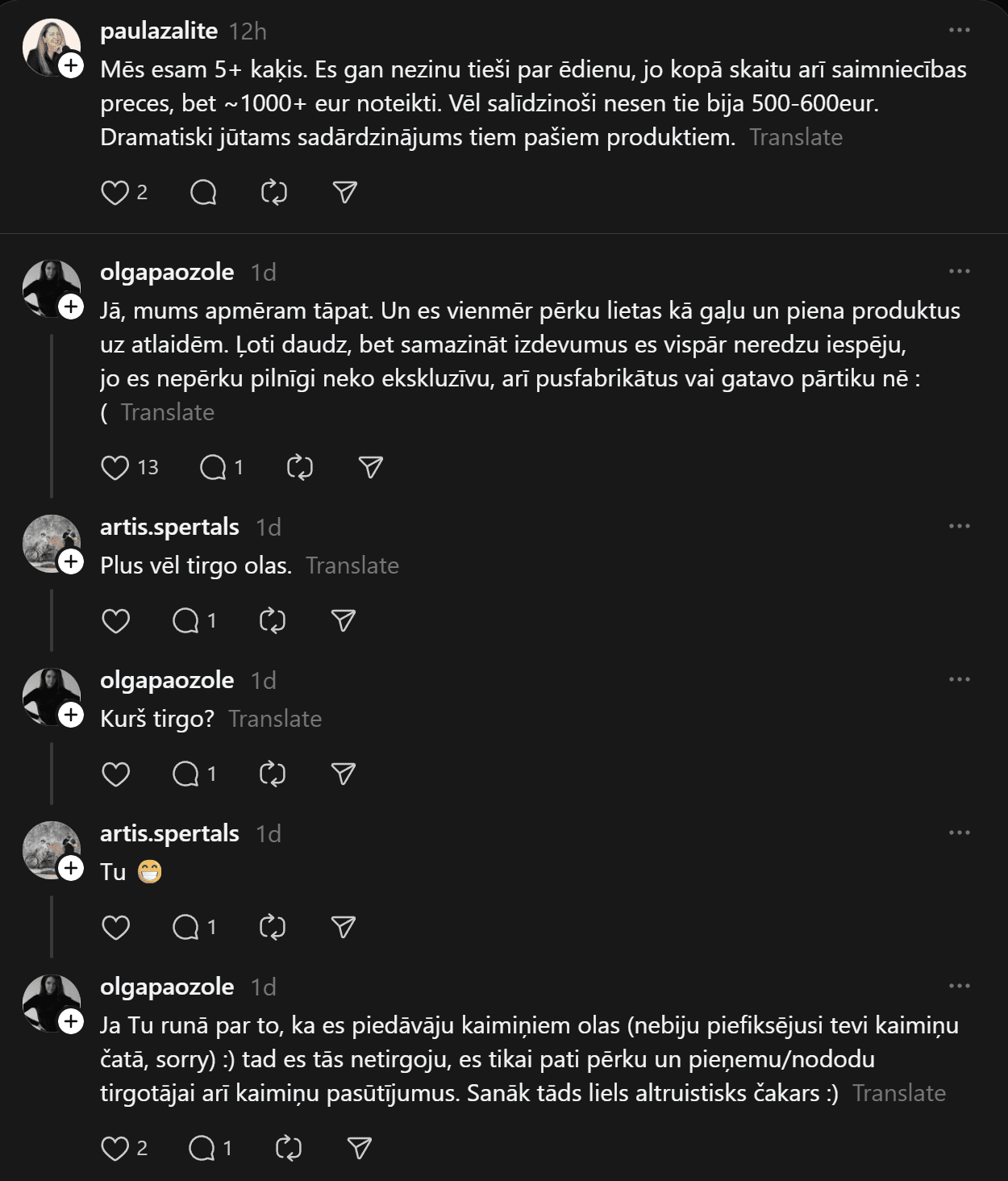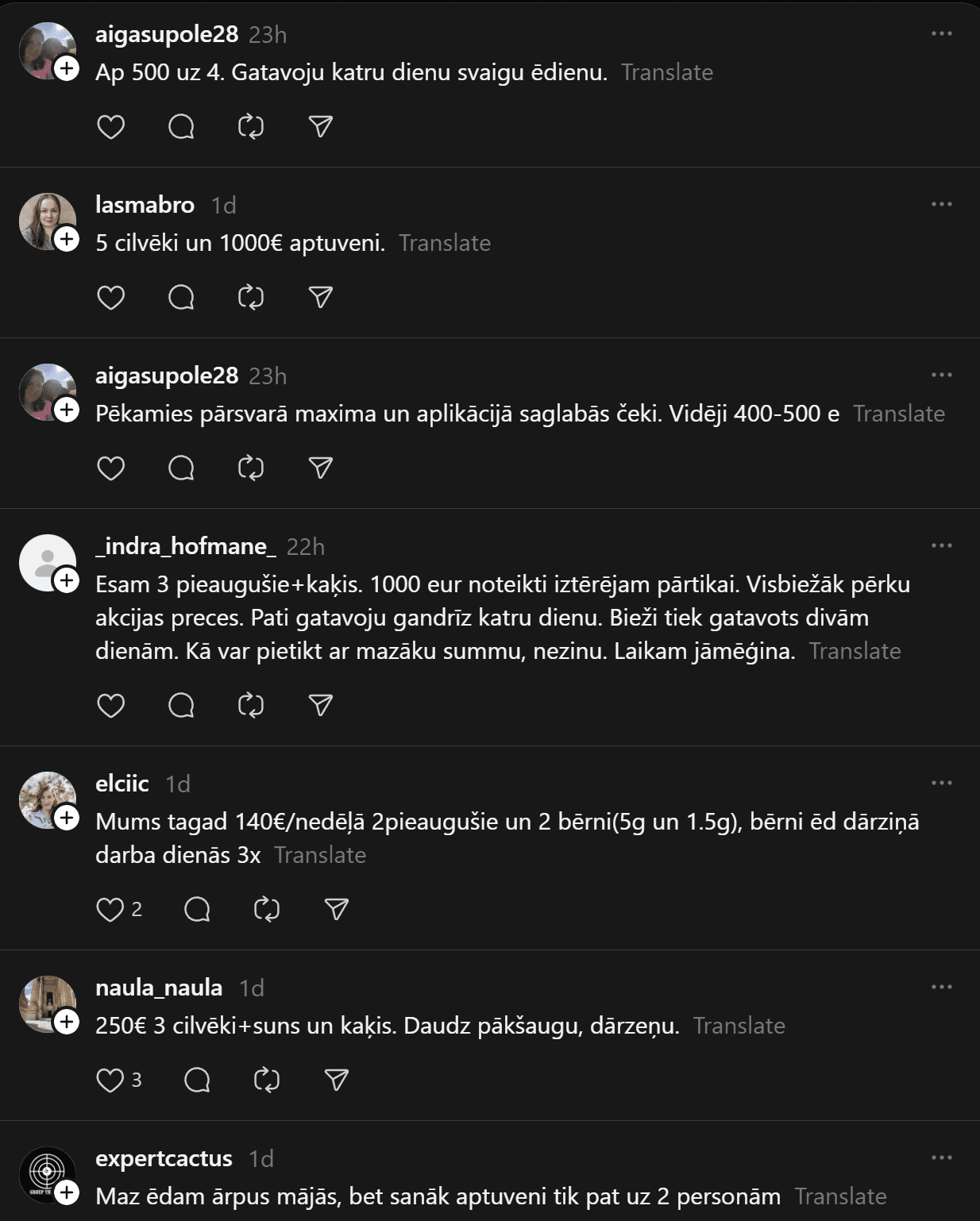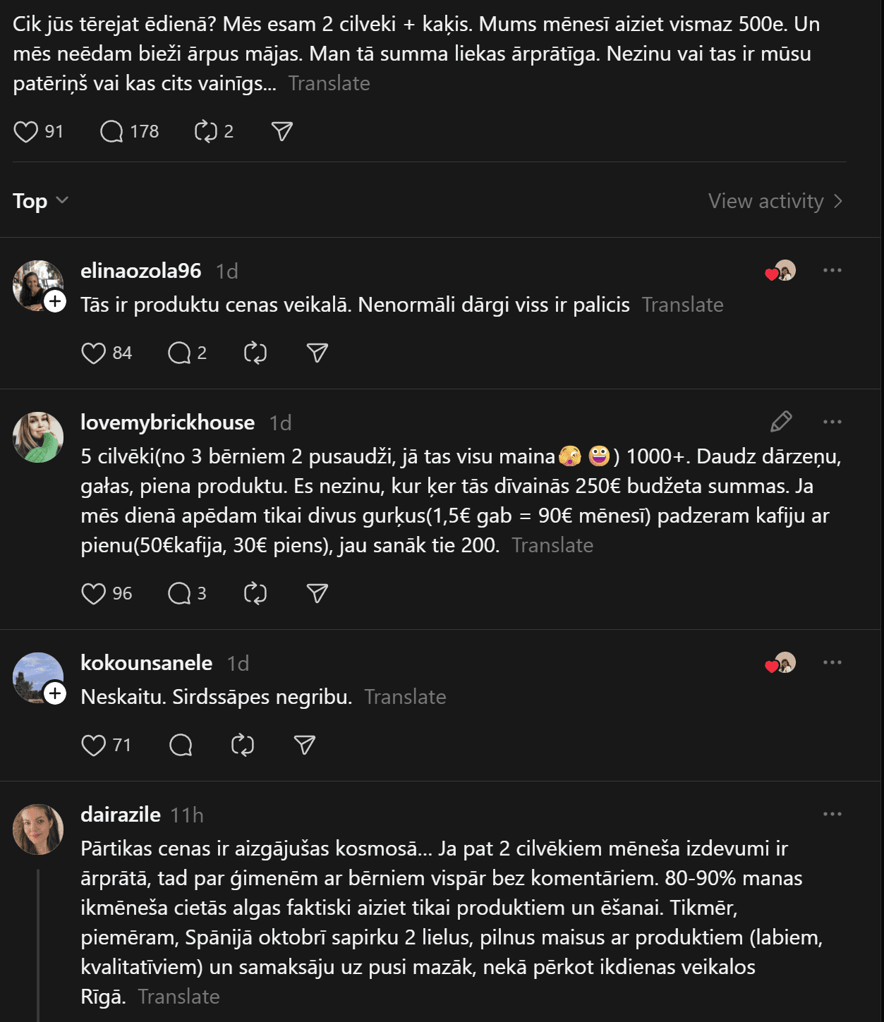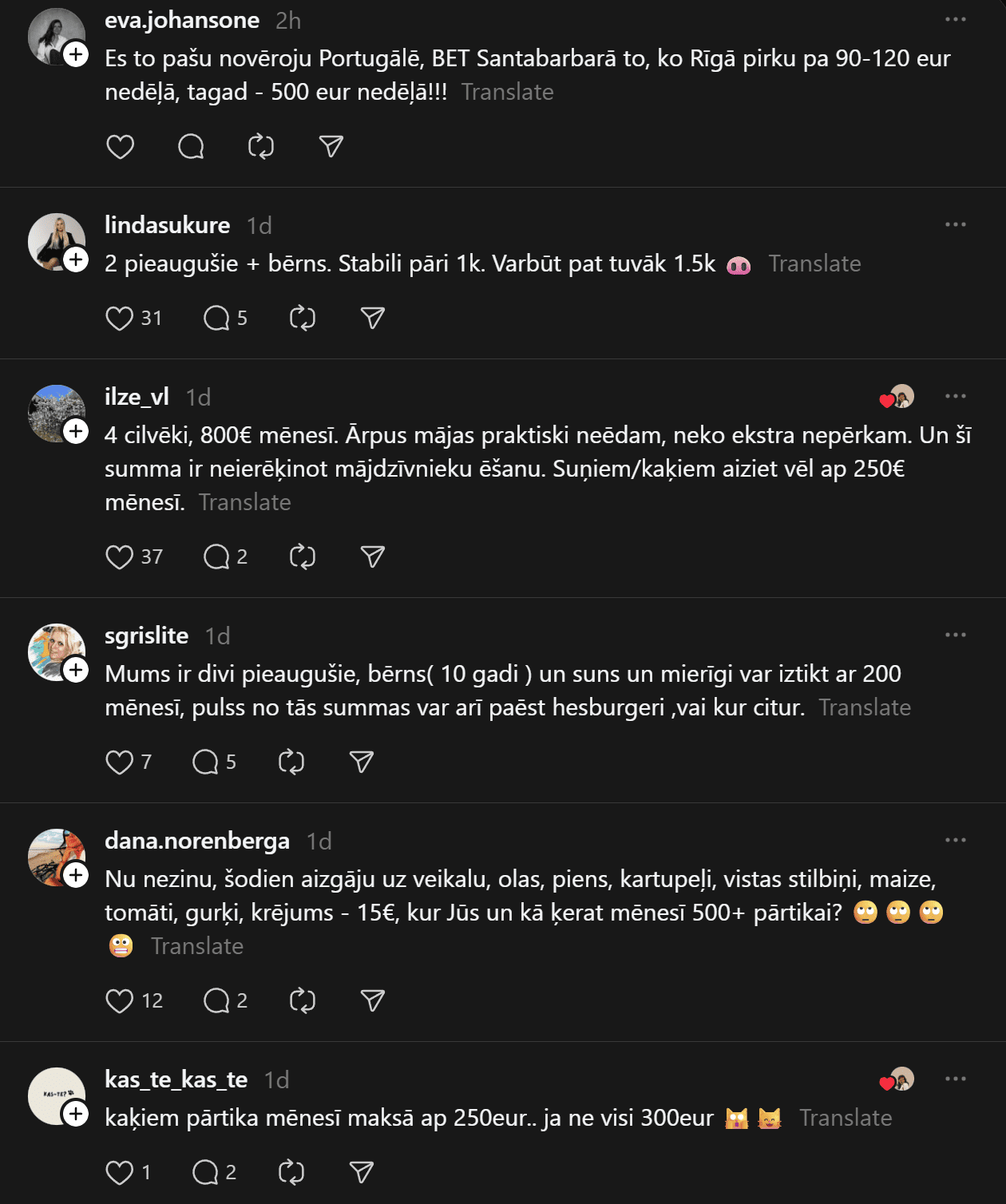 Komentāros ļaudis atklāj, ka “Pārtikas cenas ir aizgājušas kosmosā… Ja pat 2 cilvēkiem mēneša izdevumi ir ārprātā, tad par ģimenēm ar bērniem vispār bez komentāriem. 80-90% manas ikmēneša cietās algas faktiski aiziet tikai produktiem un ēšanai. Tikmēr, piemēram, Spānijā oktobrī sapirku 2 lielus, pilnus maisus ar produktiem (labiem, kvalitatīviem) un samaksāju uz pusi mazāk, nekā pērkot ikdienas veikalos Rīgā.”