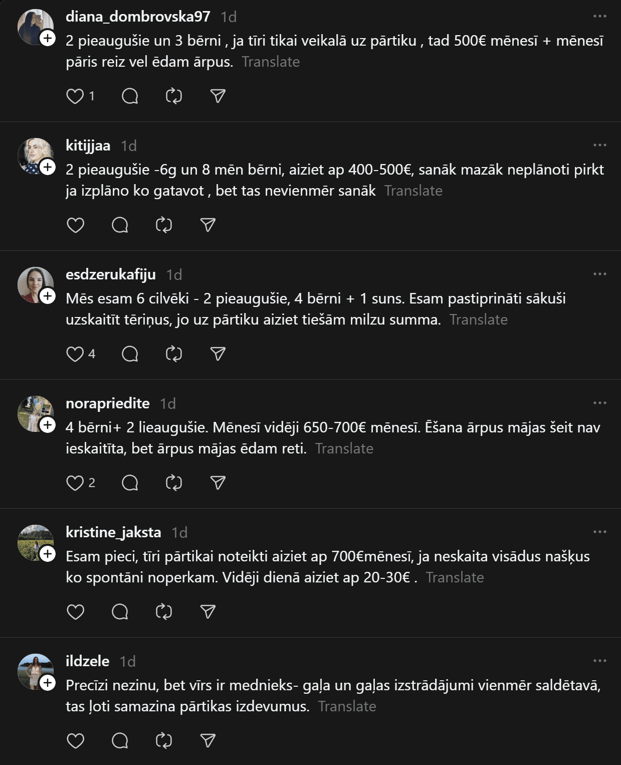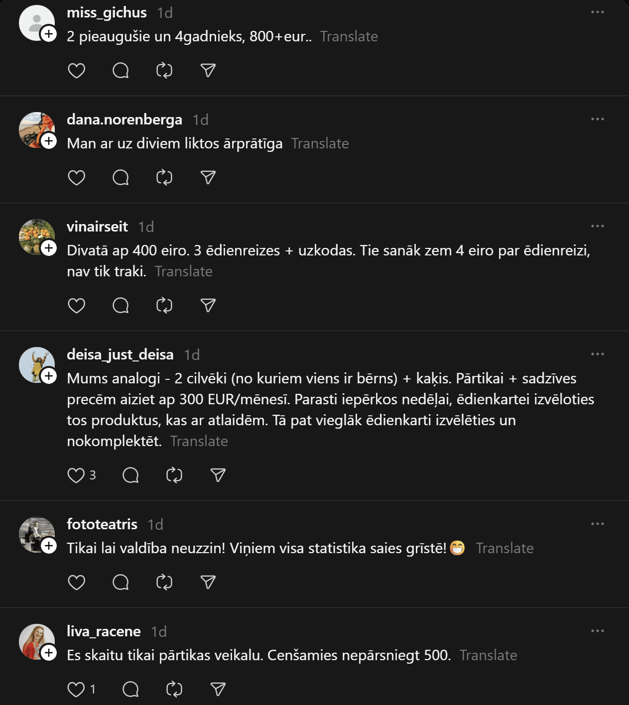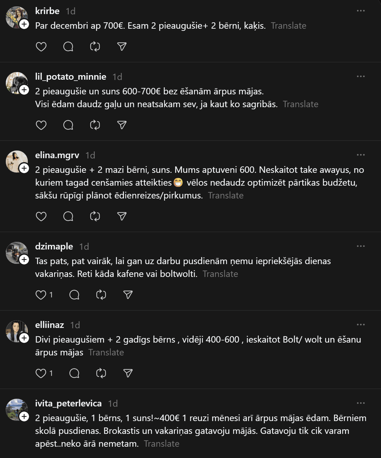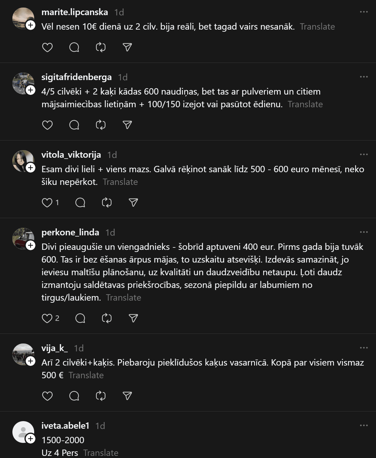 Komentāros ļaudis atklāj, ka “Pārtikas cenas ir aizgājušas kosmosā… Ja pat 2 cilvēkiem mēneša izdevumi ir ārprātā, tad par ģimenēm ar bērniem vispār bez komentāriem. 80-90% manas ikmēneša cietās algas faktiski aiziet tikai produktiem un ēšanai. Tikmēr, piemēram, Spānijā oktobrī sapirku 2 lielus, pilnus maisus ar produktiem (labiem, kvalitatīviem) un samaksāju uz pusi mazāk, nekā pērkot ikdienas veikalos Rīgā.”
