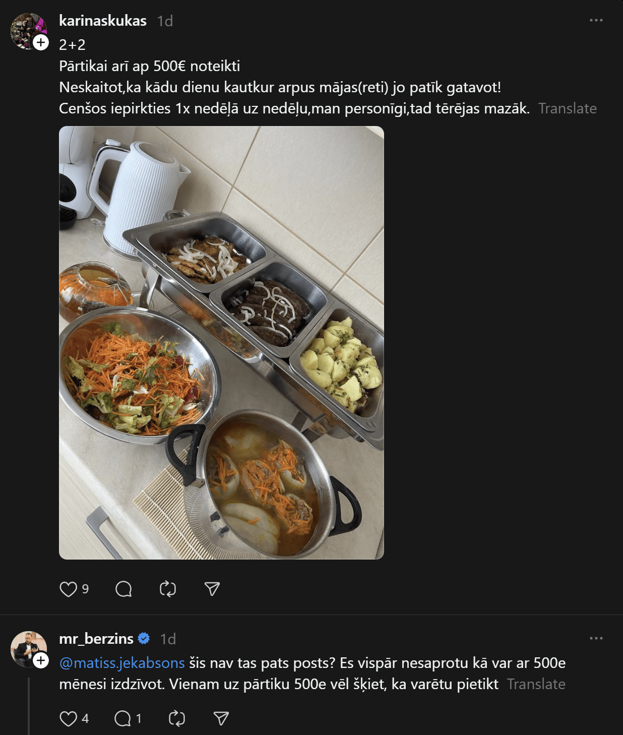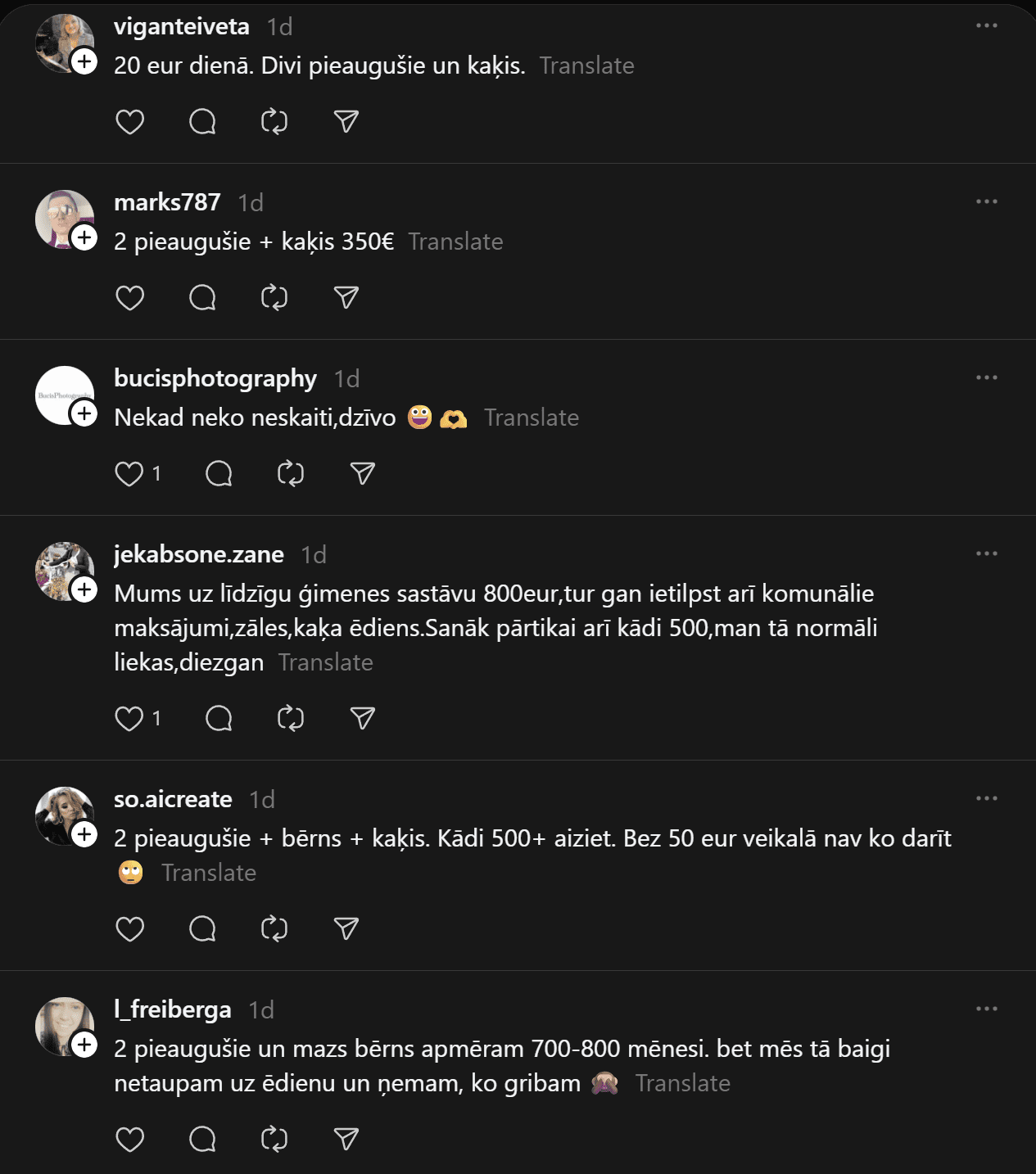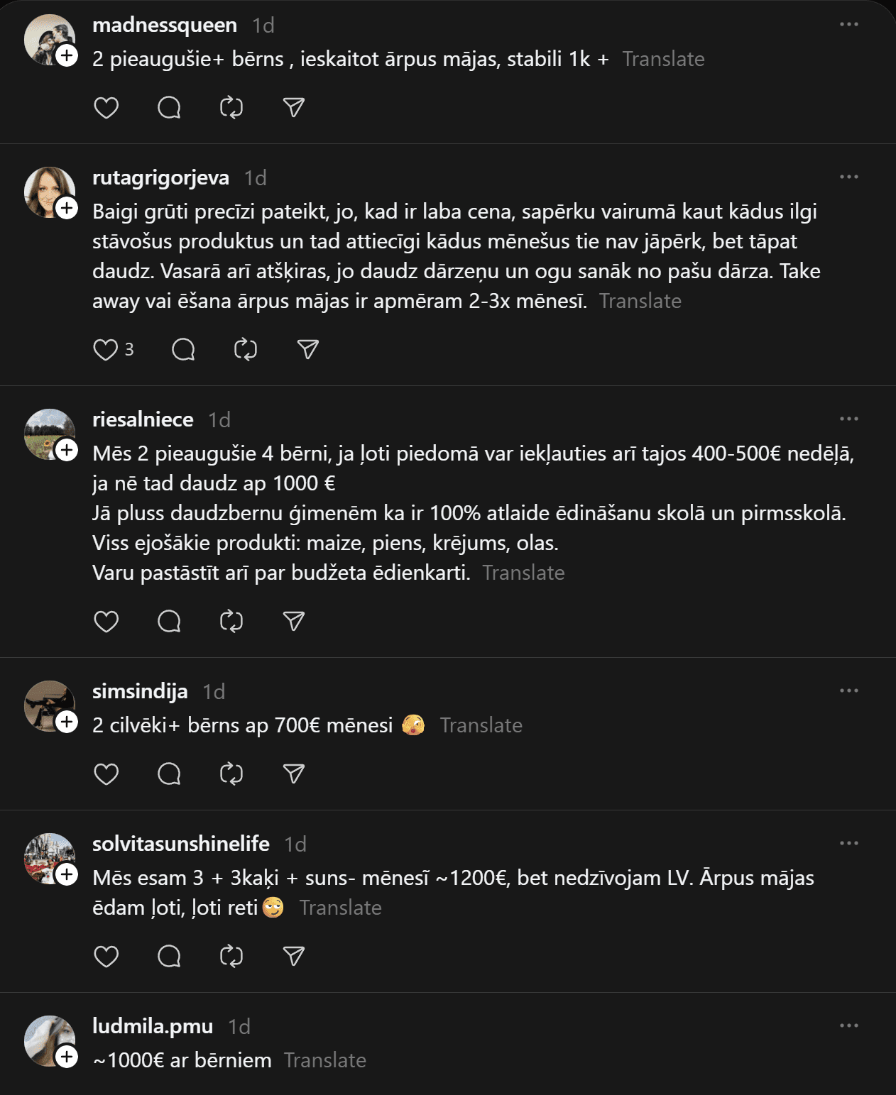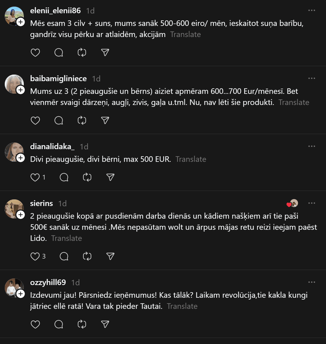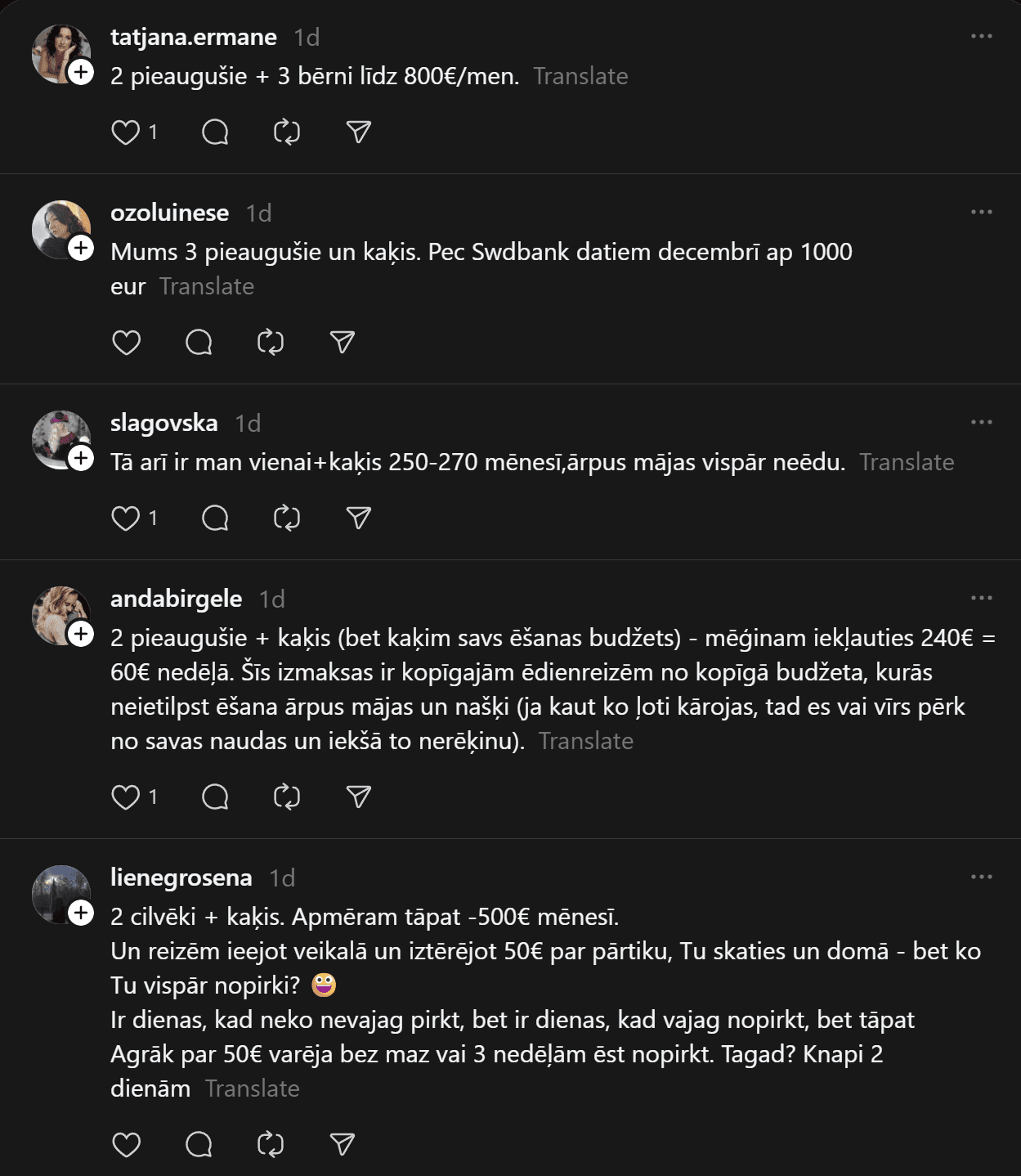 Komentāros ļaudis atklāj, ka “Pārtikas cenas ir aizgājušas kosmosā… Ja pat 2 cilvēkiem mēneša izdevumi ir ārprātā, tad par ģimenēm ar bērniem vispār bez komentāriem. 80-90% manas ikmēneša cietās algas faktiski aiziet tikai produktiem un ēšanai. Tikmēr, piemēram, Spānijā oktobrī sapirku 2 lielus, pilnus maisus ar produktiem (labiem, kvalitatīviem) un samaksāju uz pusi mazāk, nekā pērkot ikdienas veikalos Rīgā.”