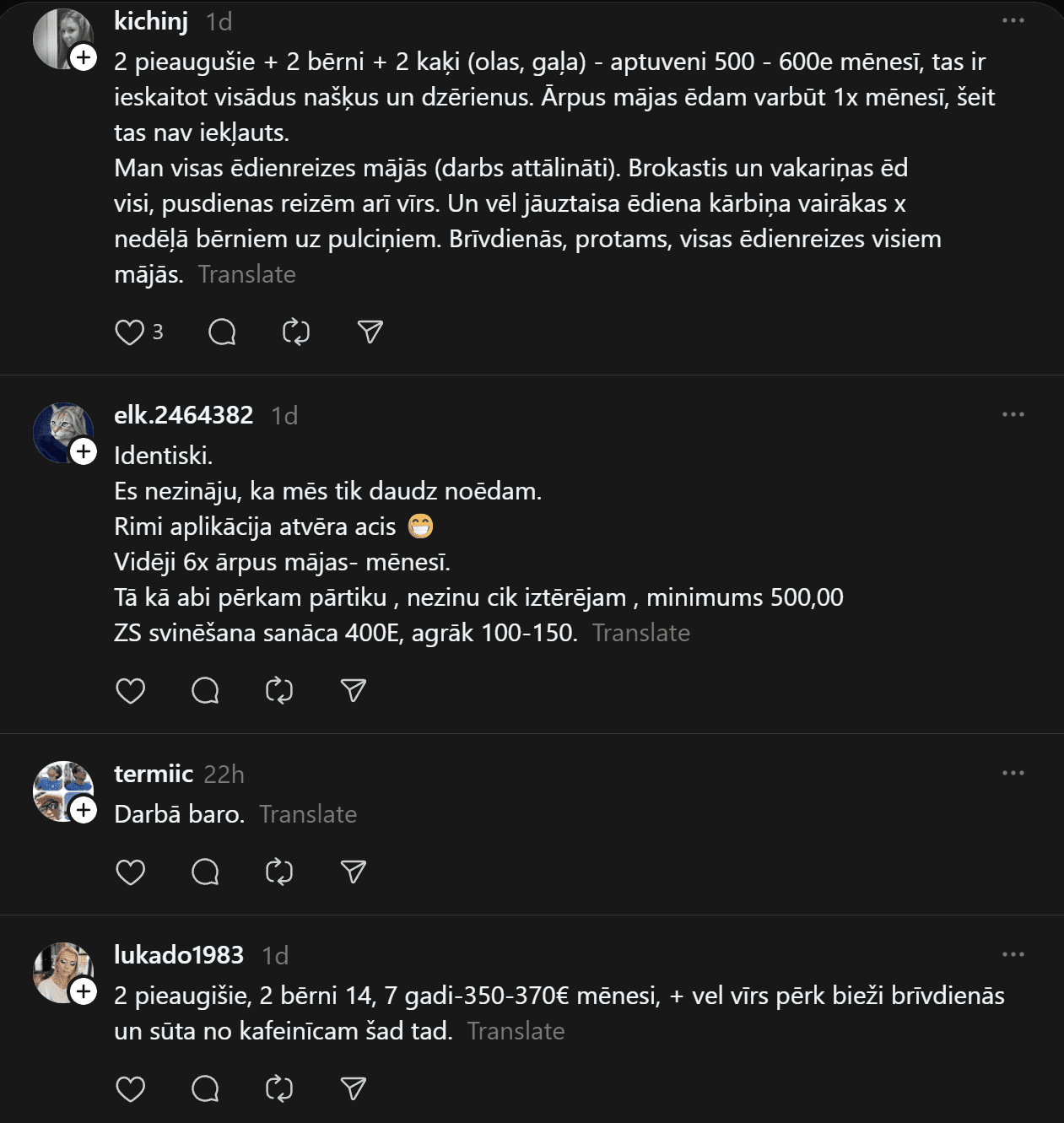 Cita mamma norāda: “1000 eiro uz 2 pieaugušajiem un 3 bērniem. Gatavojam gan daudz paši, gan ēdam ārpus mājas, pluss našķi un pusfabrikāti. Diemžēl liels % ienākumu aiziet pārtikas izdevumos, bet cenas…tās ir kosmiskas. Ēšana darbā, dažas x mēnesī izejam visi aktivitātēs ārpus mājas un tradicionāli ir jāpaēd, darba nedēļas beigas vai bērnu mazos panākumus atzīmējam ar kādu gardu piegādi mājās. Iešana ciemos/ciemiņu uzņemšana un gardumi galdam. Apbrīnoju tos, kam izdodas ietaupīt!”