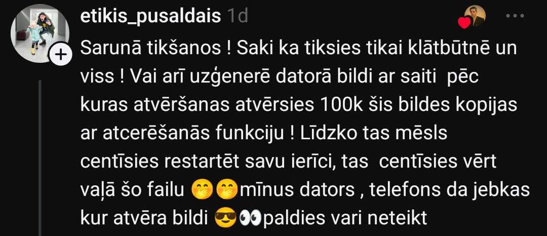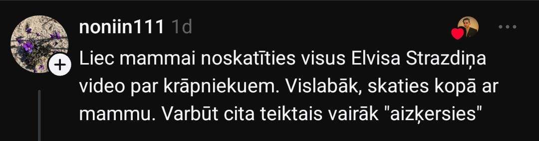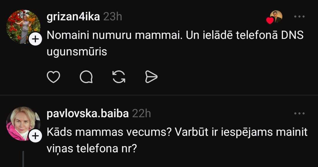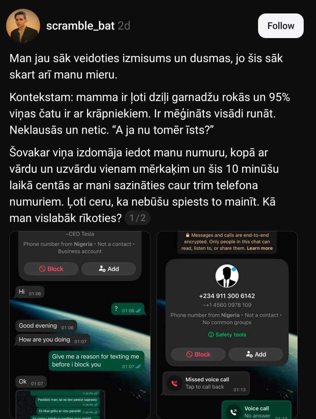 Viņš ierakstā dalās ar savu satraukumu: “Man jau sāk veidoties izmisums un dusmas, jo šis sāk skart arī manu mieru. Kontekstam: mamma ir ļoti dziļi garnadžu rokās, un 95% viņas čatu ir ar krāpniekiem.