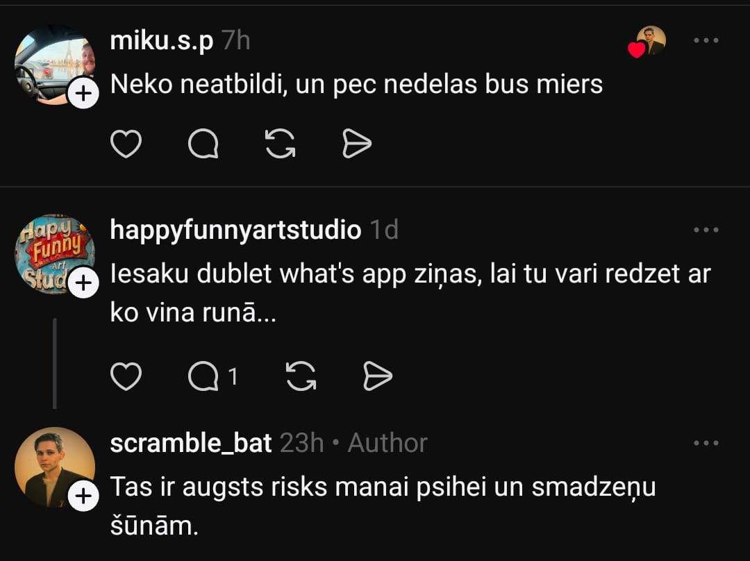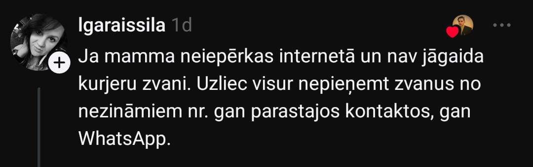 Savukārt Andžejs iesaka tehnisku risinājumu: “Pamēģini ielādēt “Hiya” – tā ir aplikācija, kas bloķē visus zināmos krāpnieku numurus un sadarbojas ar “Apple”. Pats lietoju, un neviens ne zvana, ne raksta. Tāpat iesaku ignorēt numurus, kas raksta – krāpnieki parasti ātri padodas, ja viņiem neatbild.”