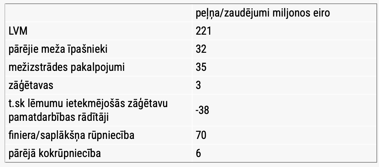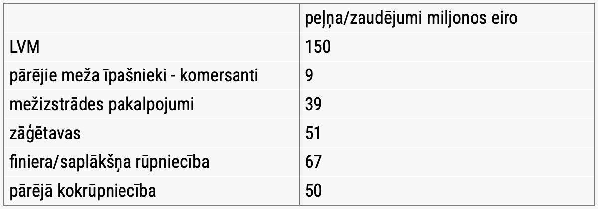 Salīdzinājumam, VID dati par 2024 gadu liecina, ka nozare kā ķēde ir nopelnījusi 366 milj., bet šoreiz peļņa ir sadalījusies vienmērīgāk peļņa/zaudējumi 2024. gadā miljonos eiro: LVM 150; pārējie meža īpašnieki – komersanti 9; mežizstrādes pakalpojumi 39; zāģētavas 51; finiera/saplākšņa rūpniecība 67; pārējā kokrūpniecība 50.