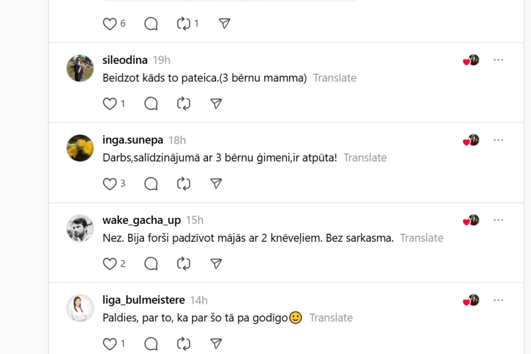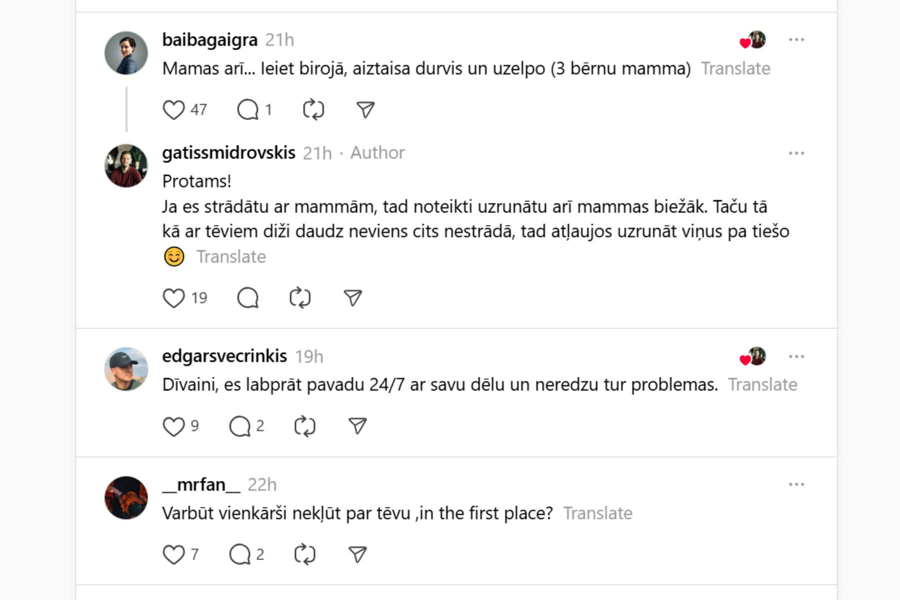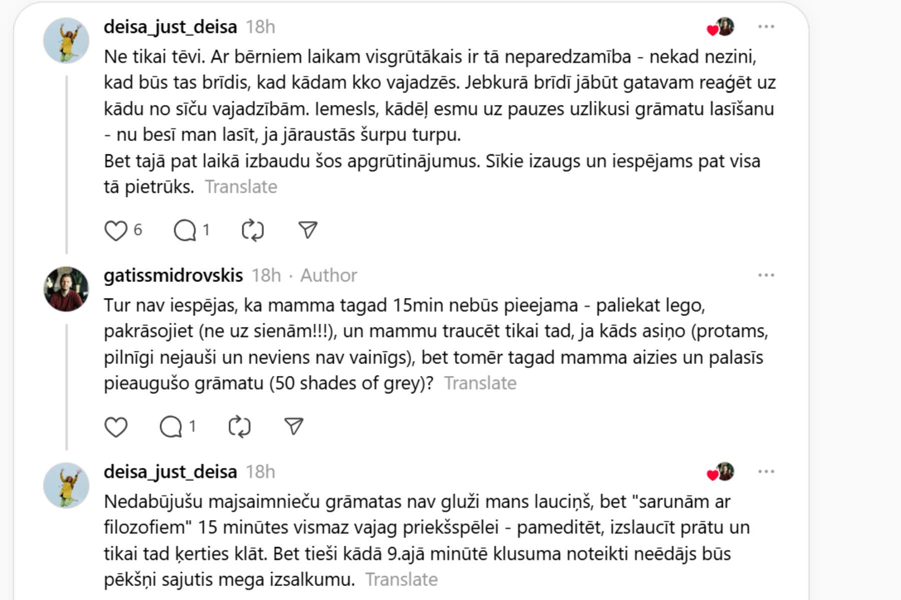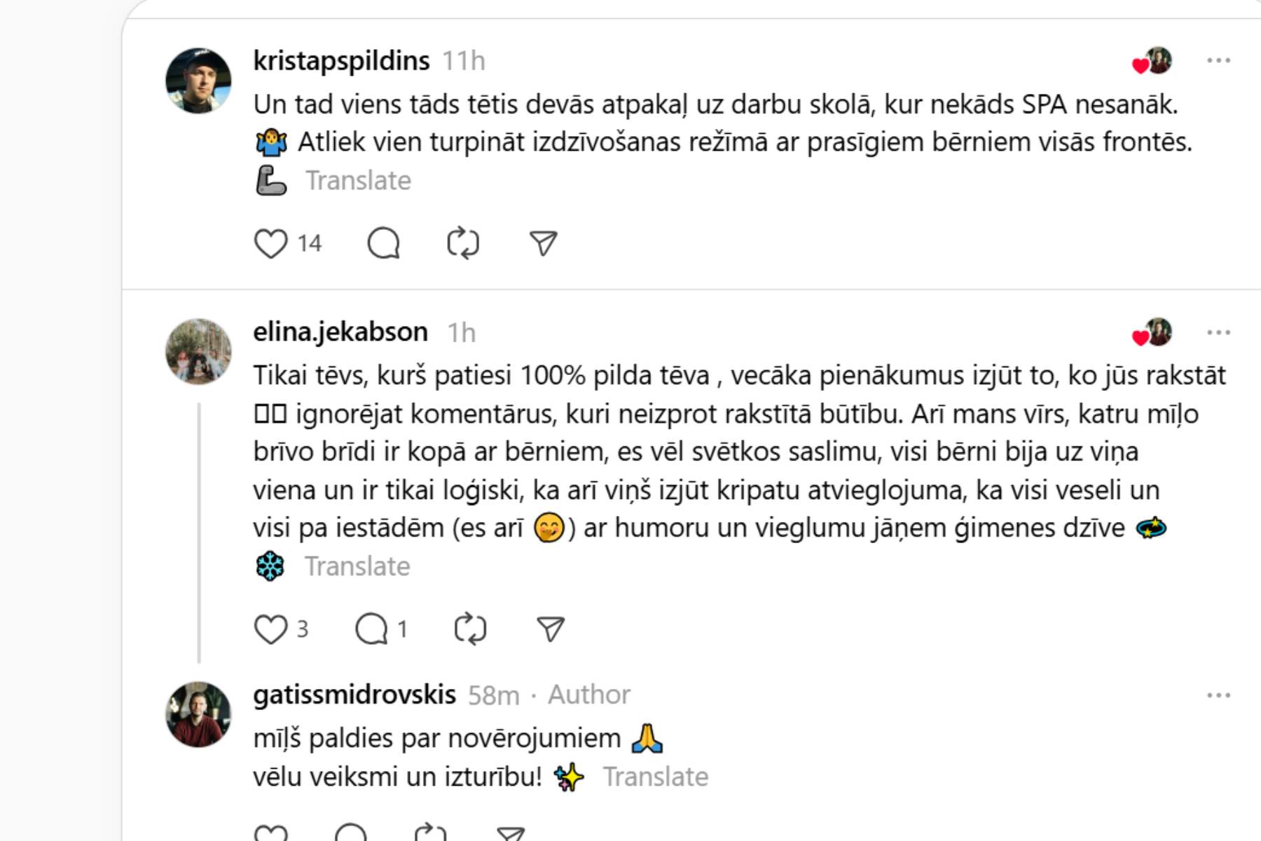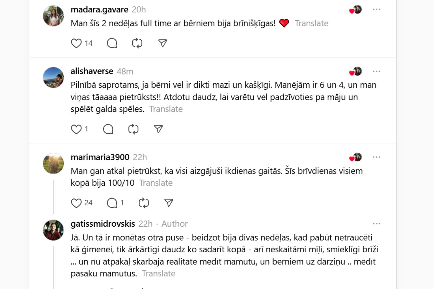 Daudzi komentētāji zem šī ieraksta saka, ka, kamēr mājās dienas ar bērniem ir piepildītas, intensīvas — pilnas ar nepārtrauktu uzmanību, plānošanu un nemitīgu komunikāciju — atgriešanās darba ritmā šķiet gluži kā SPA vai neliels kūrorts. Tās nav sūdzības par darbu, bet drīzāk atzīšanās — darbs dod struktūru, personīgo telpu un iespēju pārslēgt nekontrolējamās domas pēc būšanas ģimenē.