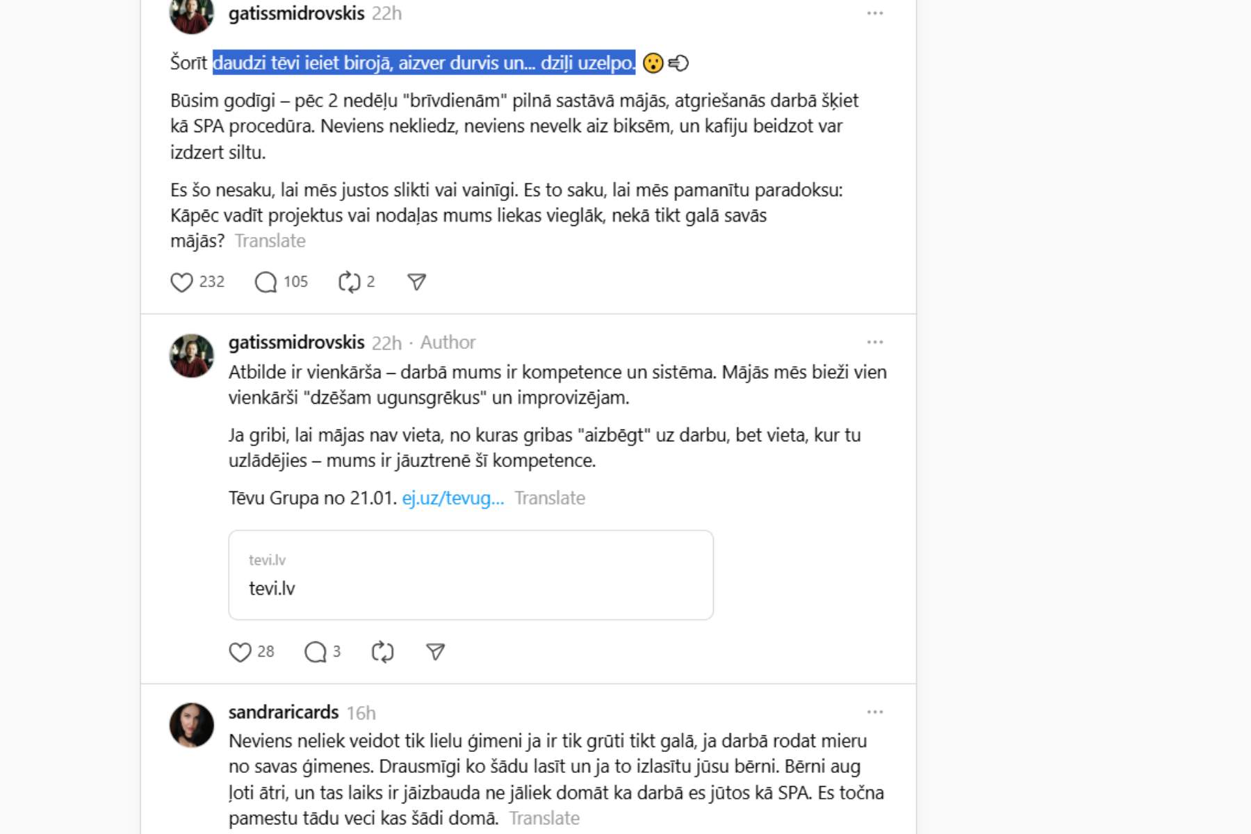Darbs pēc garajām svētku brīvdienām kopā ar bērniem, ar ģimeni, radiem, nebeidzamām svinībām ir kā svētība, kā baznīca, kurā var iet un gūt mieru – tas tā, tēlaini izsakoties. Arī socvietnē Threads par šo tēmu izvērtusies diskusija, apbrīnu vēršot būtībā pret sievietēm un viņu spēju būt “multimāksliniecēm” – darīt darbu, kopt māju, pieskatīt bērnus – skolas, dārziņi, potes, drēbes, samīļot, šķirt strīdus u.t.t.