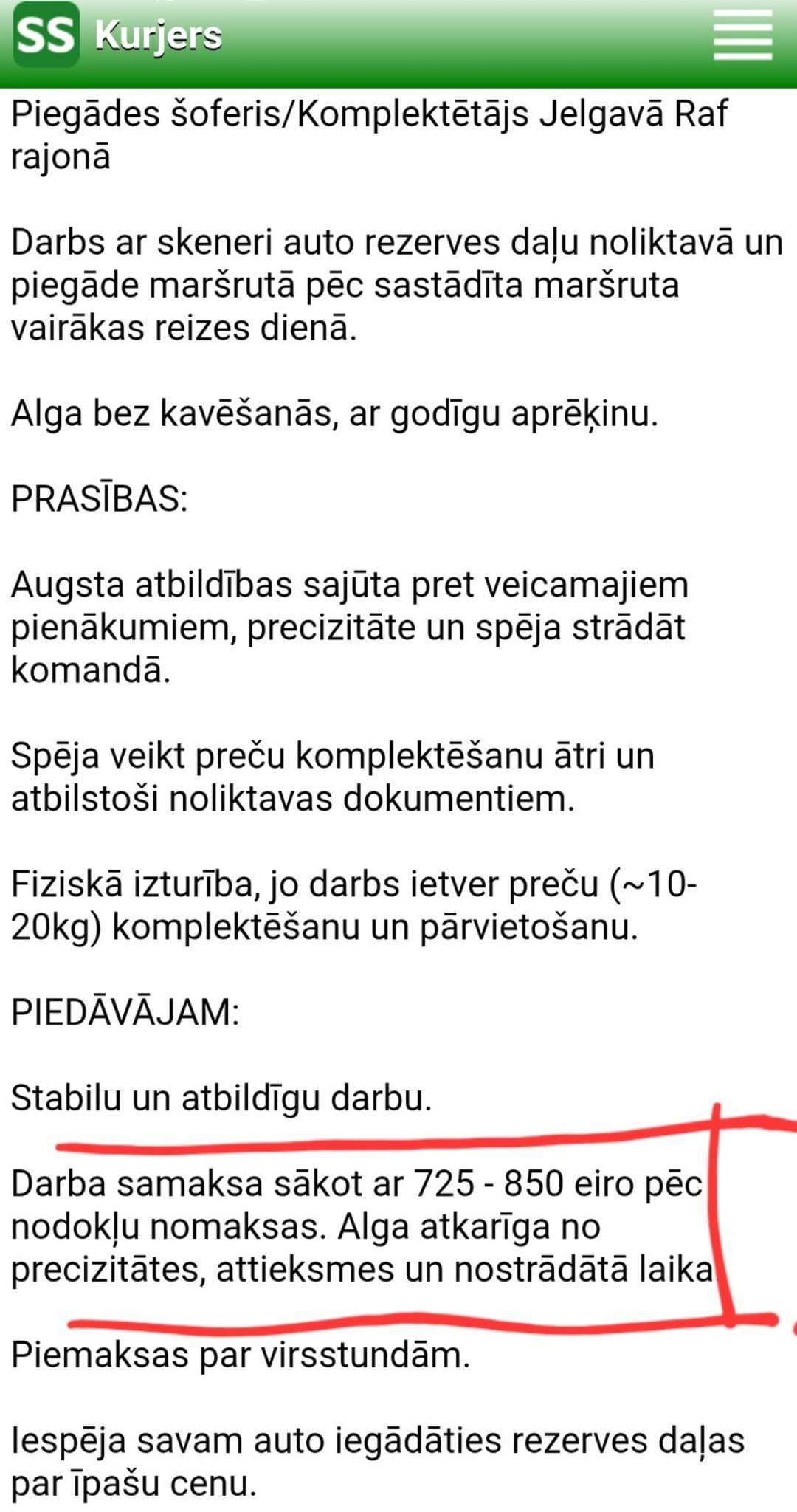 Sludinājumā norādīts, ka Jelgavā tiek meklēts kurjers/komplektētājs. Tiek solīts, ka alga tiks izmaksāta bez kavēšanās, savukārt darba samaksa svārstās no 725 līdz 850 eiro, piebilstot, ka atalgojums ir atkarīgs no attieksmes, nostrādātā laika un precizitātes. Tāpat minēta iespēja saņemt piemaksas par virsstundām.