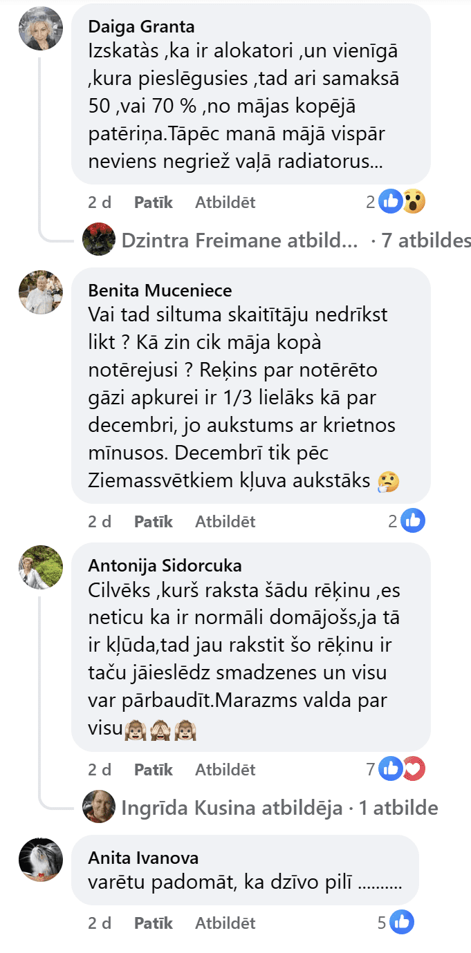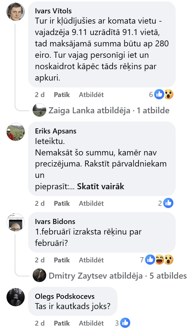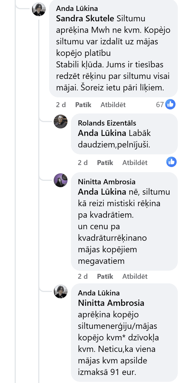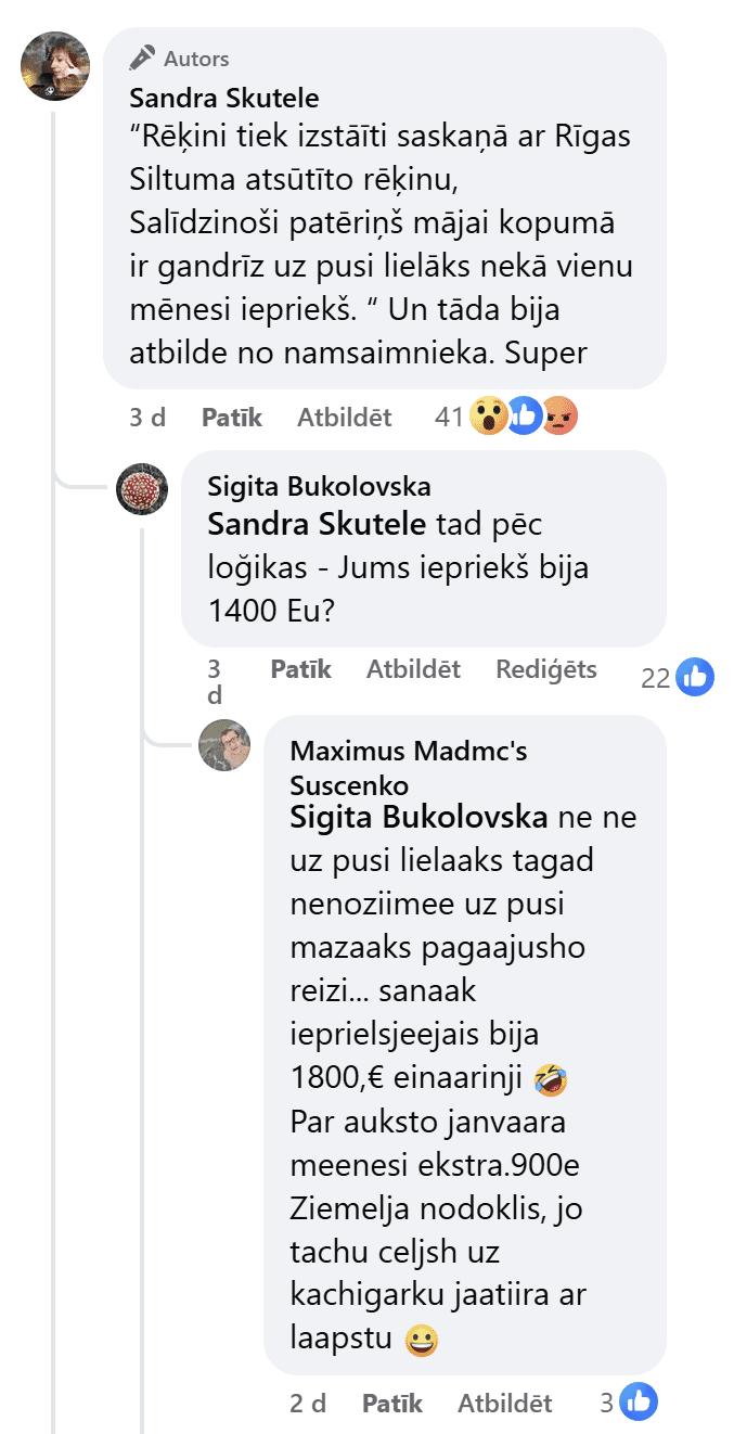 Ieraksta autore gan pati atbild, ka “Rēķini tiek izrakstīti saskaņā ar Rīgas Siltuma atsūtīto rēķinu. Salīdzinoši patēriņš mājai kopumā ir gandrīz uz pusi lielāks nekā vienu mēnesi iepriekš.” Un tāda bija atbilde no namsaimnieka. Super!”
