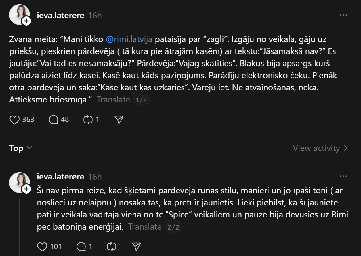 “Rimi Spicē pie ātrajām kasēm ir tikai viena superīga kasiere — Inga. Vienmēr pozitīva, laipna. Ārkārtīgi sirsnīga. Pārējās — nu tā. @rimi.latvija, izmantošu momentu un atstāšu atsauksmi — lūdzu, novērtējiet šo foršo darbinieci!”
