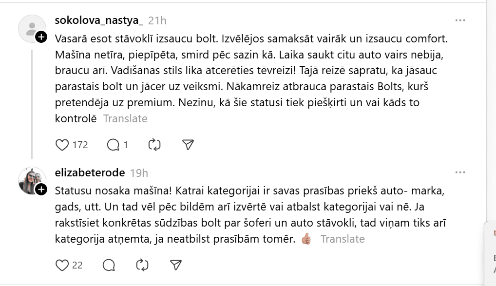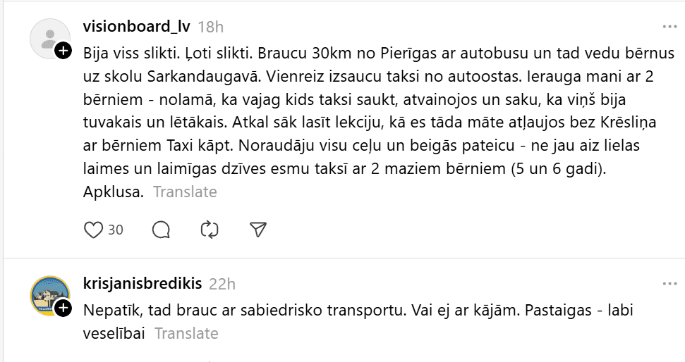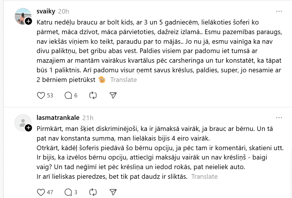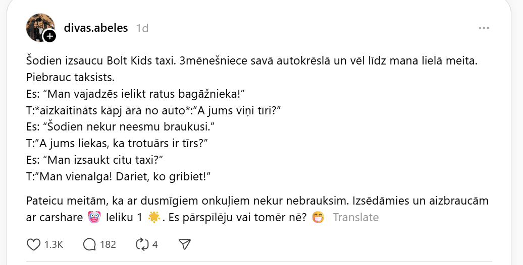 Pēdējam minējumam līdzīgu situāciju ar uzvedībā diezgan rupju taksistu piedzīvojusi kāda “Thread” lietotāja, kura vēlējās brauciena laikā bērna ratiņus ievietot automašīnas bagāžniekā. Sieviete raksta: “Šodien izsaucu Bolt Kids taksi. 3 mēnešniece savā autokrēsliņā un vēl līdzi mana lielā meita. Piebrauc taksists.