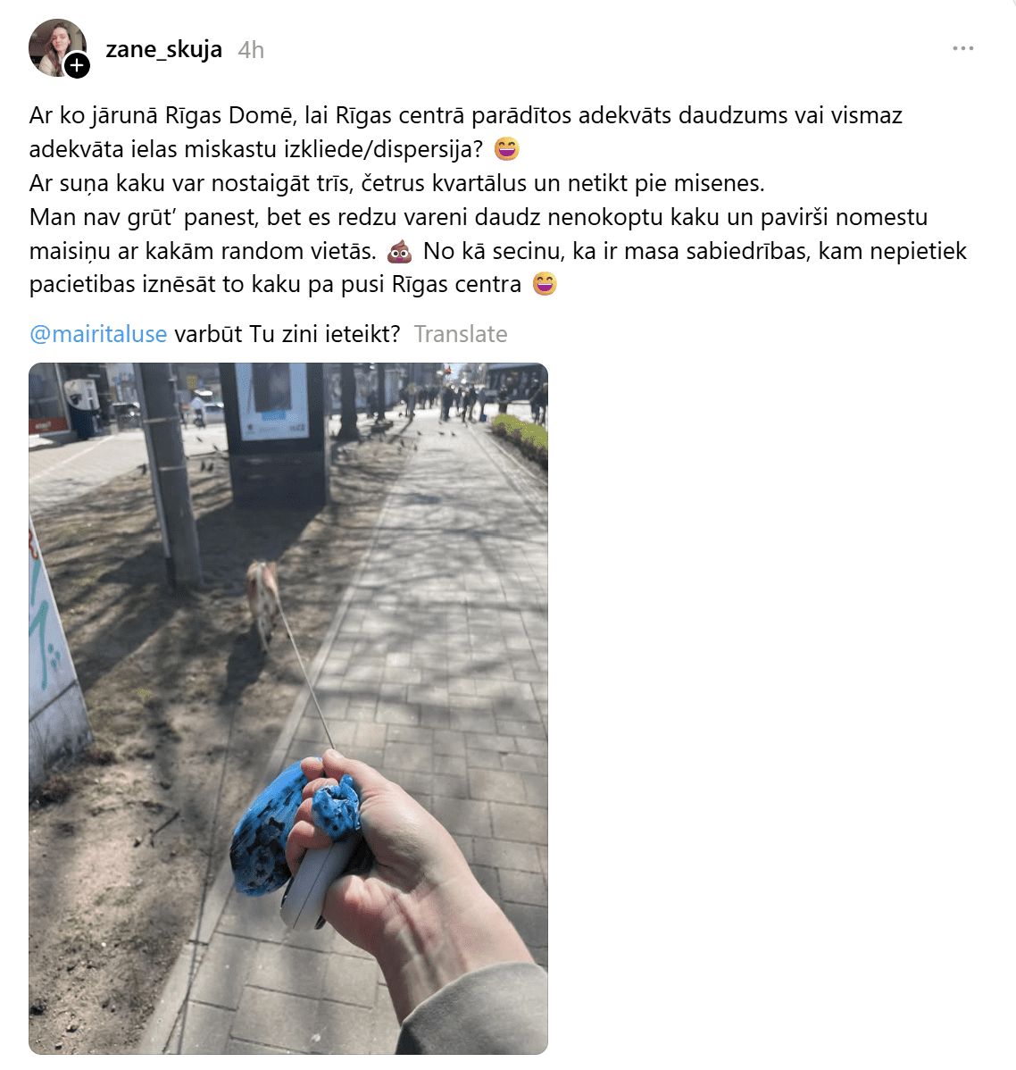 Ar suņa kaku var nostaigāt trīs, četrus kvartālus un netikt pie misenes. Man nav grūti panest, bet es redzu vareni daudz nenokoptu kaku un pavirši nomestu maisiņu ar kakām dažādās vietās. No kā secinu, ka ir masa sabiedrības, kam nepietiek pacietības iznēsāt to kaku pa pusi Rīgas centra,” raksta sieviete.