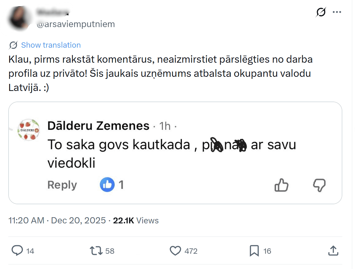 Uz to viņai atbildējis uzņēmums “Dālderu Zemenes”: “To saka govs kautkada, pi* na* ar savu viedokli.” Jāuzsver gan, ka tagad komentārs, visticamāk, ticis dzēsts.