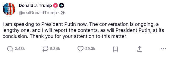 ASV prezidents Donalds Tramps savā sociālās saziņas vietnē “Truth Social” pavēstījis, ka tieši šobrīd runā ar Krievijas diktatoru Vladimiru Putinu.
