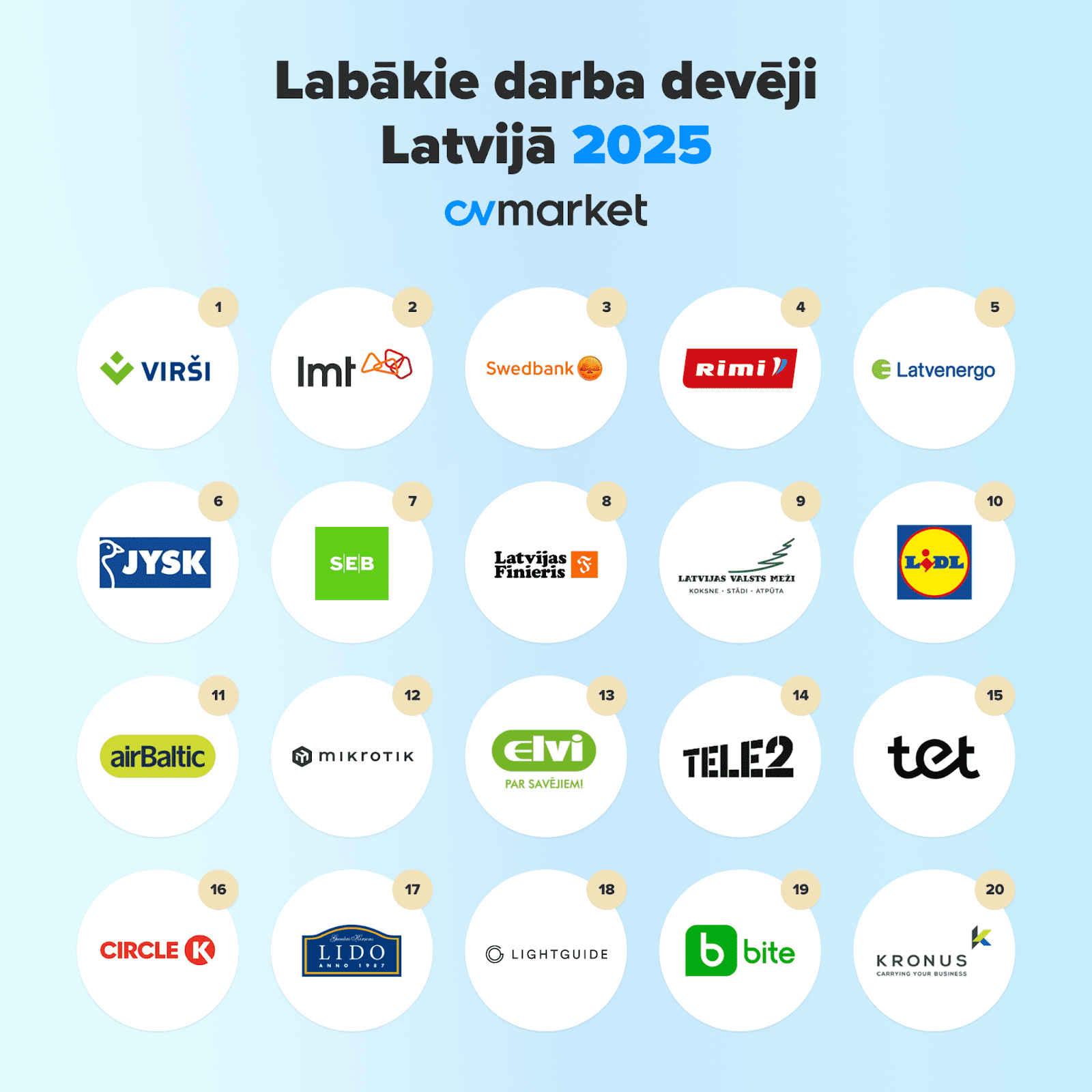 Starp divdesmit labākajiem darba devējiem, pamatojoties uz aptaujas dalībnieku balsīm, iekļuva arī Air Baltic Corporation, Mikrotīkls, VITA mārkets, Tele2, Tet, Circle K, Lido, Light Guide Optics International, Bite Latvija un Kronus.