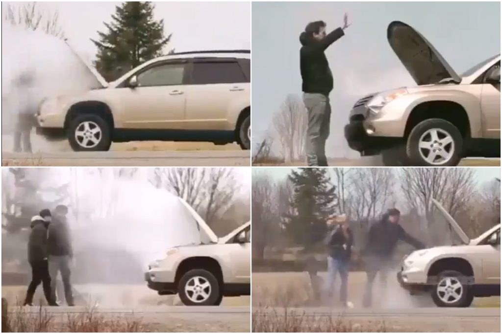 Kāds ļoti pozitīvs slēptās kameras tipa video atkal sācis riņķot pa soctīkliem. Tajā redzams kāds ceļa malā saplīsis auto, kam no motortelpas veļas balti un lieli dūmu mākoņi, bet izmisušais šoferis mēģina apstādināt kādu garāmbraucēju palīdzības lūgšanai.