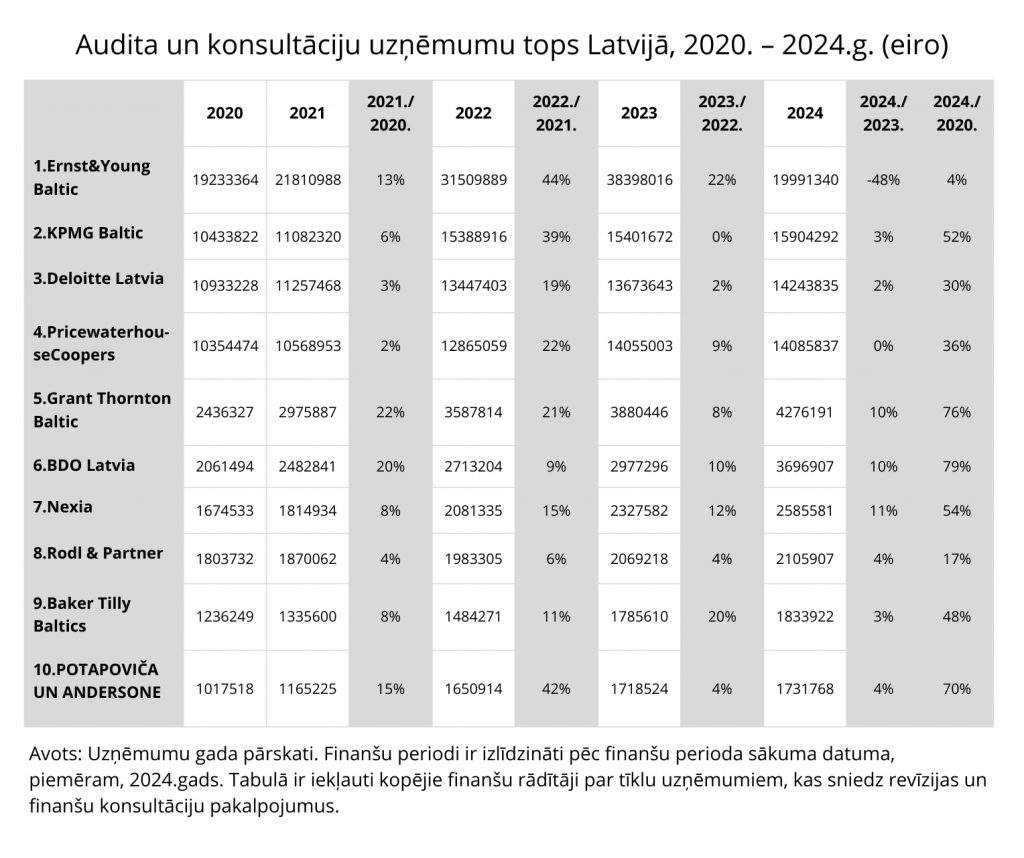 2024./2025. finanšu gadā “lielais četrinieks” paliek nemainīgs – Ernst&Young Baltic saglabāja līdera pozīciju tirgū, kam seko KPMG Baltic, Deloitte tīkla uzņēmumi un PricewaterhouseCoopers. Savukārt, auditorkompāniju Latvijā top līderu piecinieku daudzus gadus pārliecinoši noslēdz starptautiska auditorkompānija Grant Thornton Baltic, kas arī pārstāv vienu no lielākajiem auditorkompāniju tīkliem pasaulē.
