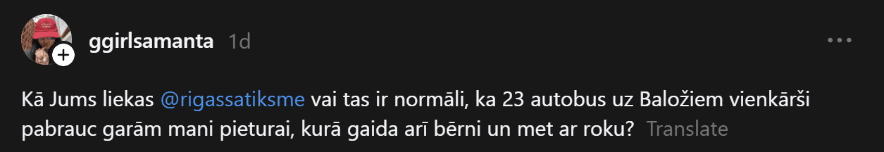 “Kā jums šķiet, “Rīgas satiksme”, vai tas ir normāli, ka 23. autobuss uz Baložiem vienkārši pabrauc garām manai pieturai, kurā gaida arī bērni, un met ar roku?” vietnē “Threads” jautā Samanta.