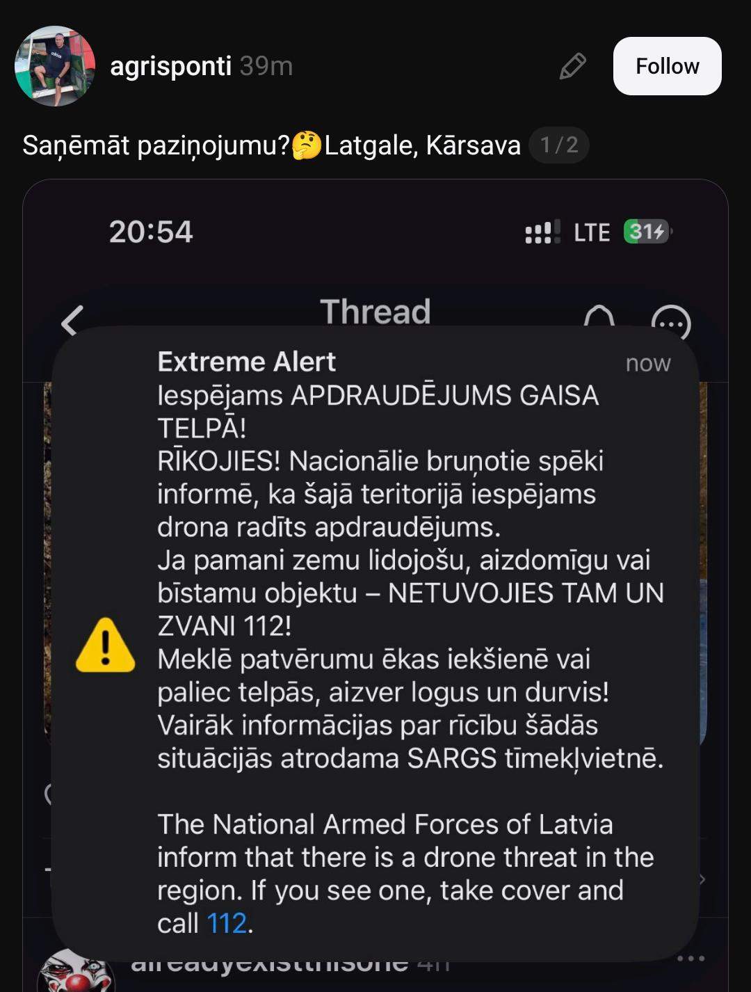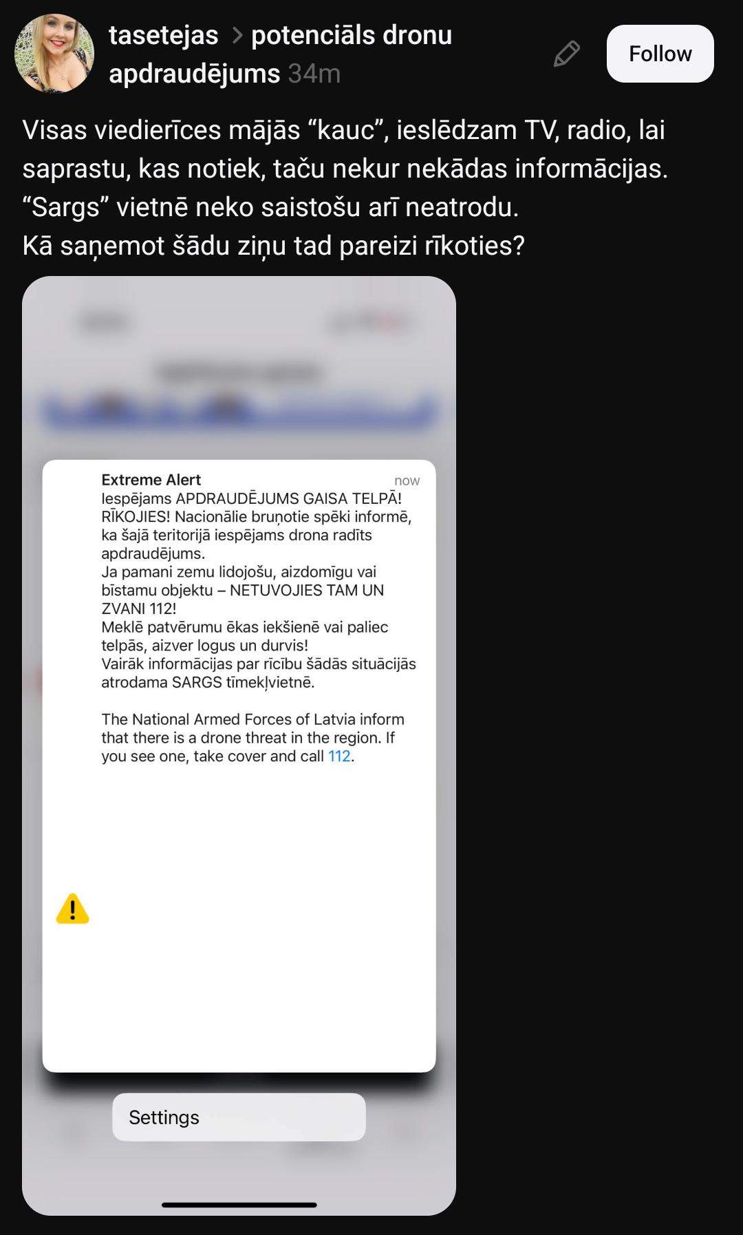 Viņi raksta: “Konstatēts ārvalsts bezpilota lidaparāts pie Latvijas robežas; apdraudējums noslēdzies