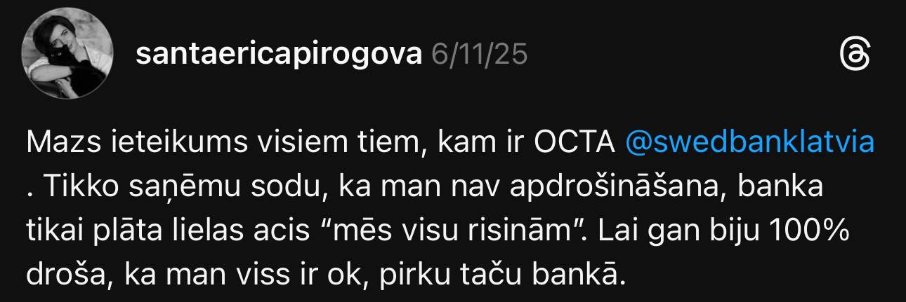 “Mazs ieteikums visiem tiem, kam ir OCTA “Swedbank”. Tikko saņēmu sodu, ka man nav apdrošināšana, banka tikai plāta lielas acis: “Mēs visu risinām”. Lai gan biju 100% droša, ka man viss ir ok – pirku taču bankā,” savā pieredzē dalās Santa. Viņa bija iegādājusies polisi ar automātisko pagarinājumu. Pagarinājums nenotika, kā rezultātā viņa saņēma sodu.