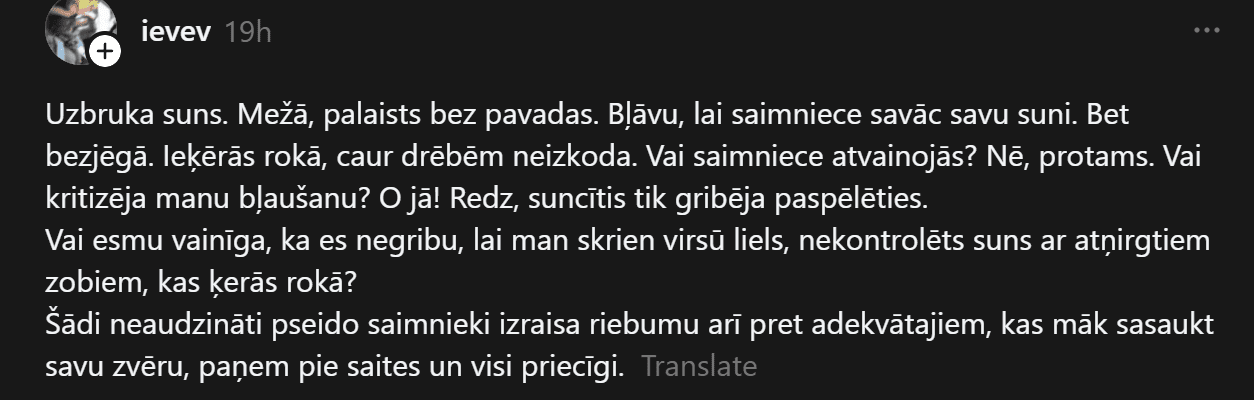 Ieva platformā “Threads” stāsta, ka viņai mežā uzbrucis suns, kas bijis palaists bez pavadas. Viņa kliegusi saimniecei, lai savāc savu suni, taču tas bijis bezjēdzīgi. Suns ieķēries viņai rokā, par laimi, caur drēbēm neesot izkodis. Ieva norāda, ka suņa saimniece ne tikai neatvainojusies, bet pat kritizējusi viņas kliegšanu, apgalvojot, ka suns vienkārši gribējis paspēlēties.