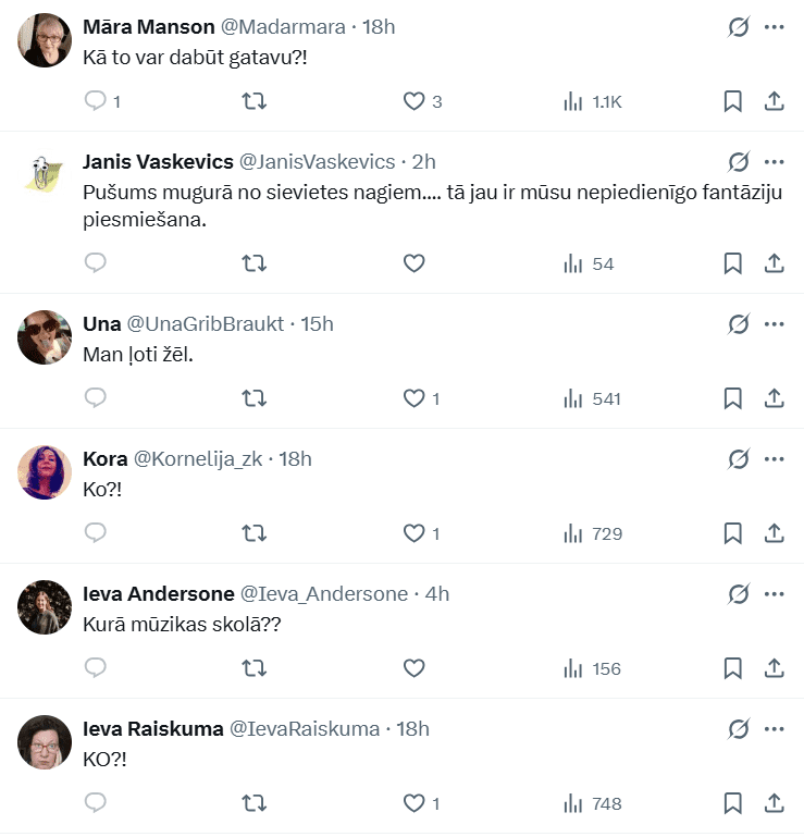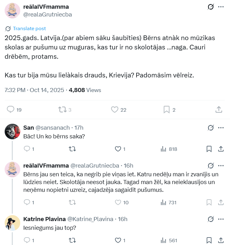 “2025.gads. Latvija.(par abiem sāku šaubīties) Bērns atnāk no mūzikas skolas ar pušumu uz muguras, kas tur ir no skolotājas naga. Cauri drēbēm, protams. Kas tur bija mūsu lielākais drauds, Krievija? Padomāsim vēlreiz,” viņa raksta.