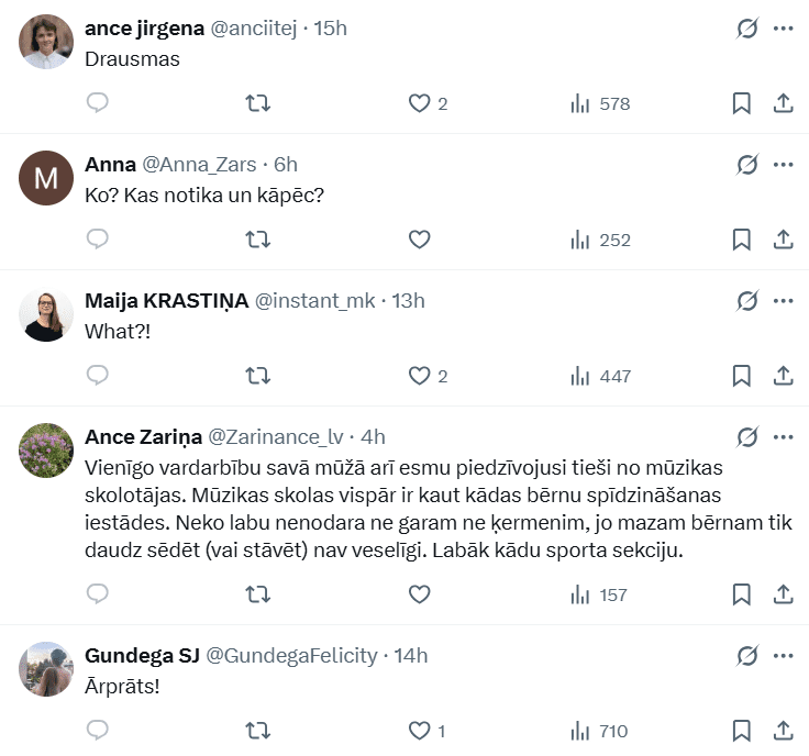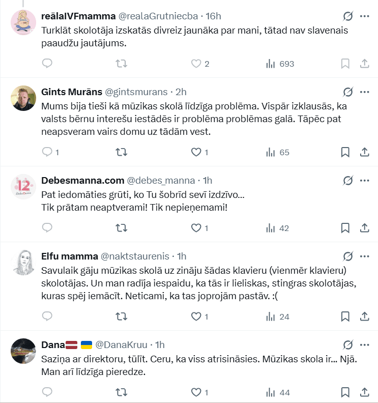 Cilvēki komentāros ir sašutuši, jautā, kā to vispār iespējams izdarīt, iesaka mammai vērsties pie tiesībsargājošām iestādēm, ziņot skolas direktoram, kā arī ne viens vien atceras savas mūzikas skolas gaitas un atzīst, ka dīvainā kārtā tieši šīs profesijas pārstāves ir bijušas visnejaukākās.