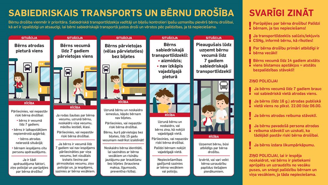 Pasažieru pārvadātāji sistemātiski tiek informēti par nepilngadīgu personu drošību sabiedriskajā transportā. Piemēram, ar šādu Valsts policijas izstrādātu materiālu: