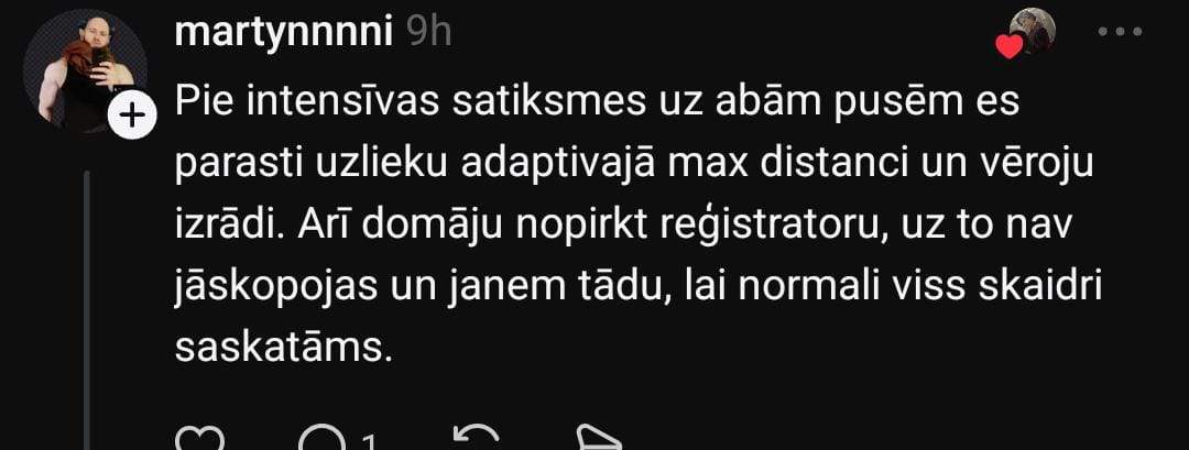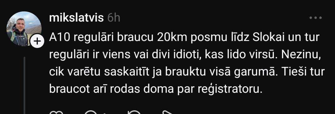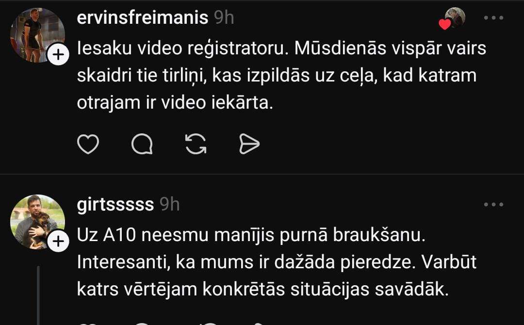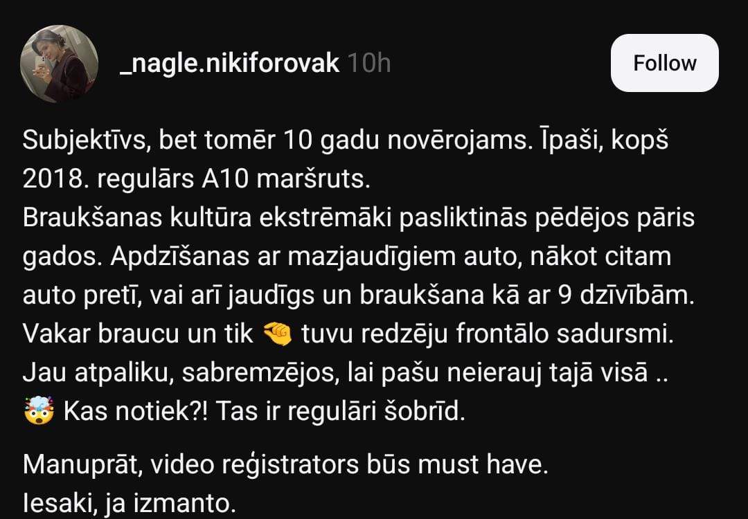 Viņa piebilst: “Vakar braucu un tik 🤏 tuvu redzēju frontālo sadursmi. Jau atpaliku, sabremzējos, lai pašu neierauj tajā visā… Kas notiek?! Tas ir regulāri šobrīd. Manuprāt, video reģistrators būs “must have”.”