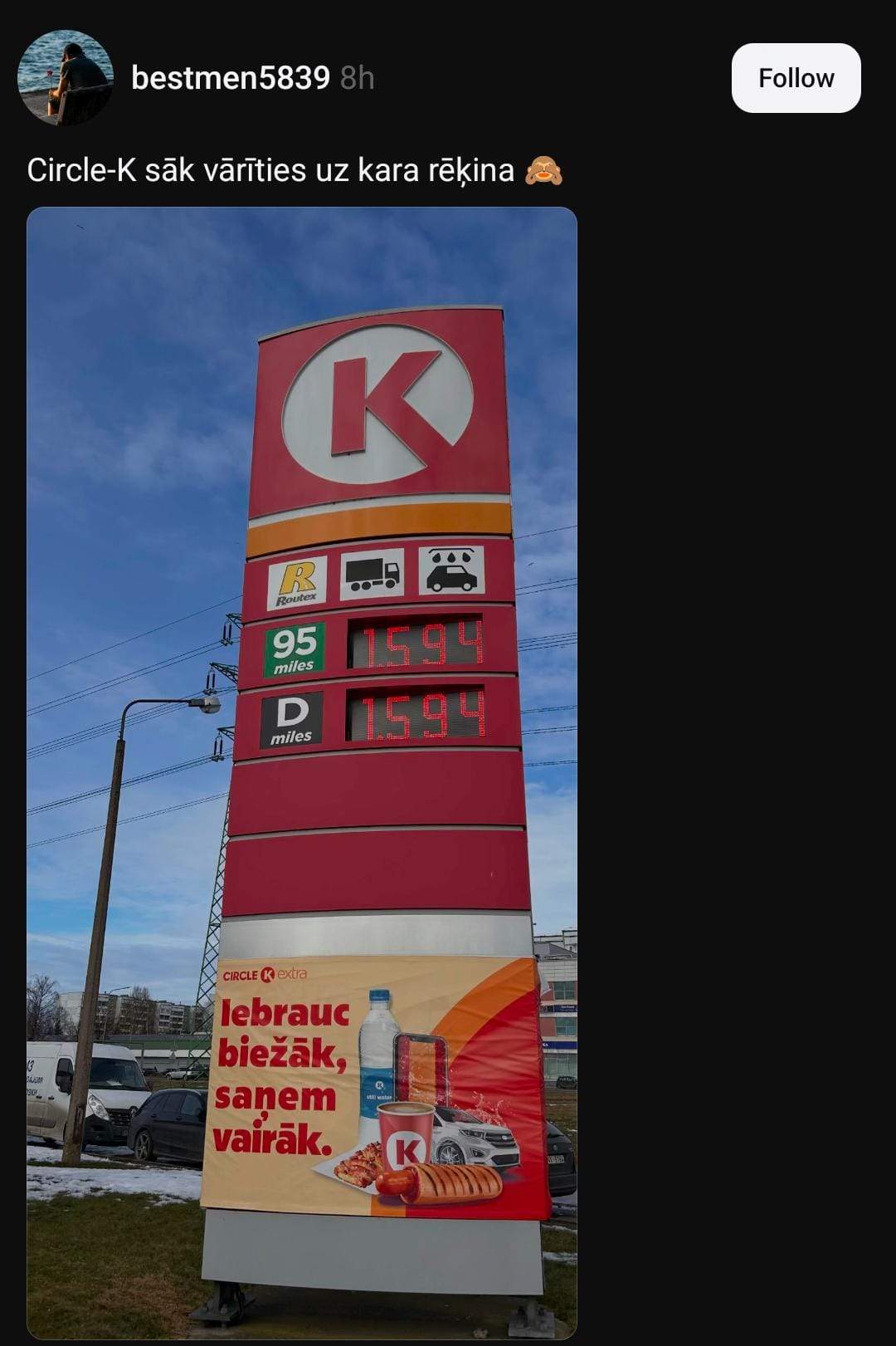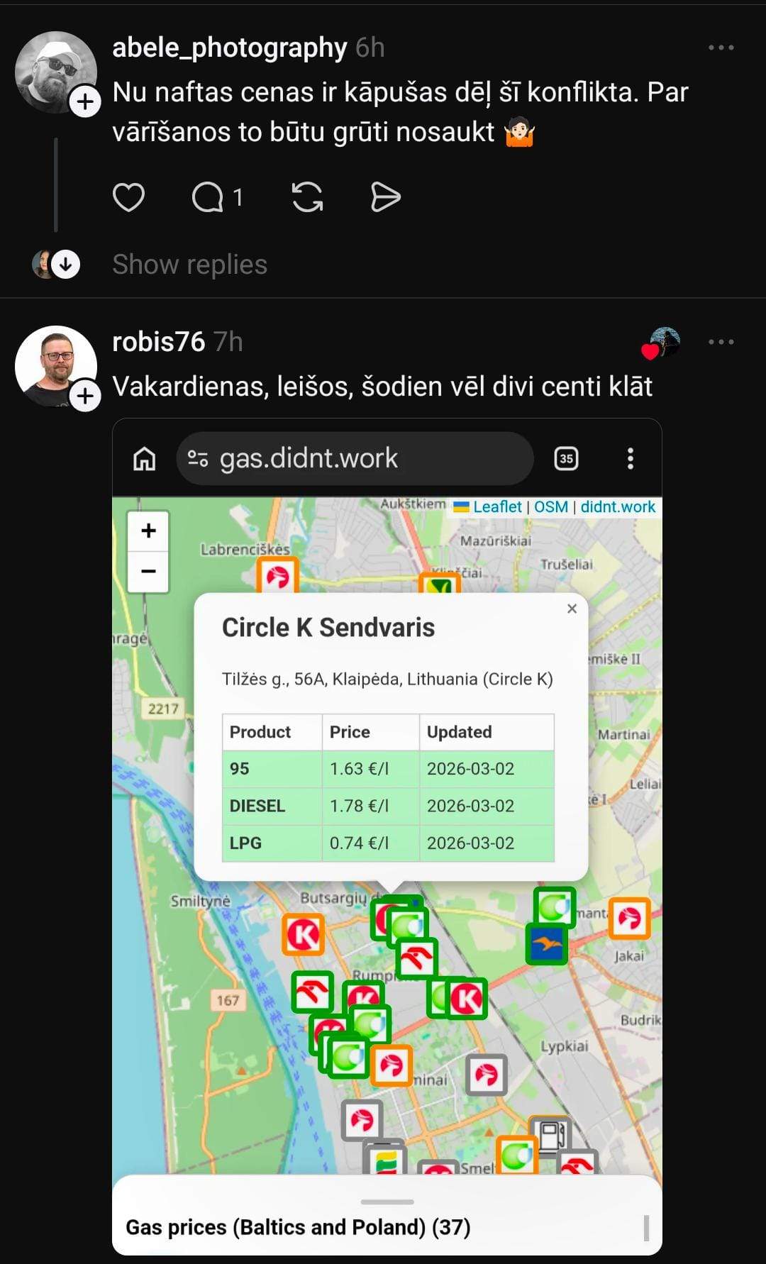 Arī Kristaps novērojis izmaiņas: “Braucu Liepājā iekšā – 1,564. Piecpadsmit minūtes vēlāk braucu ārā no Liepājas – 1,594.”