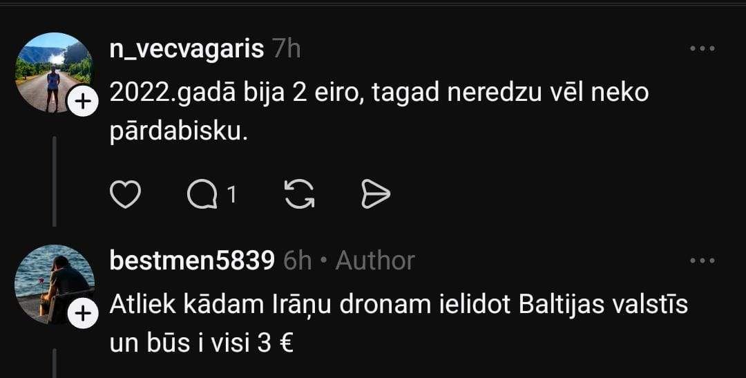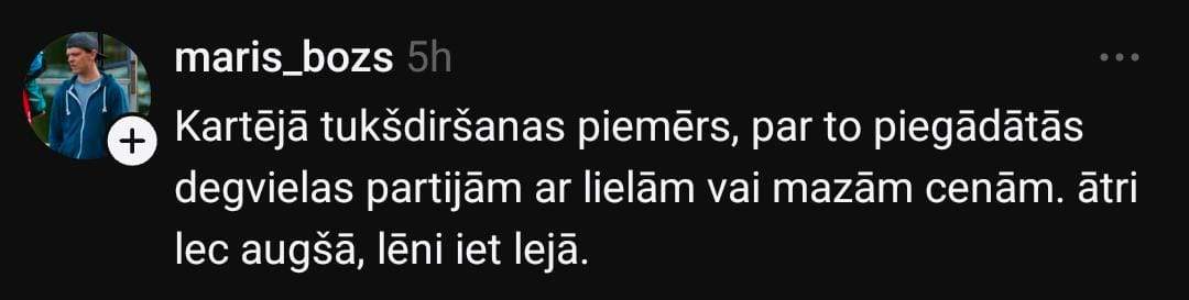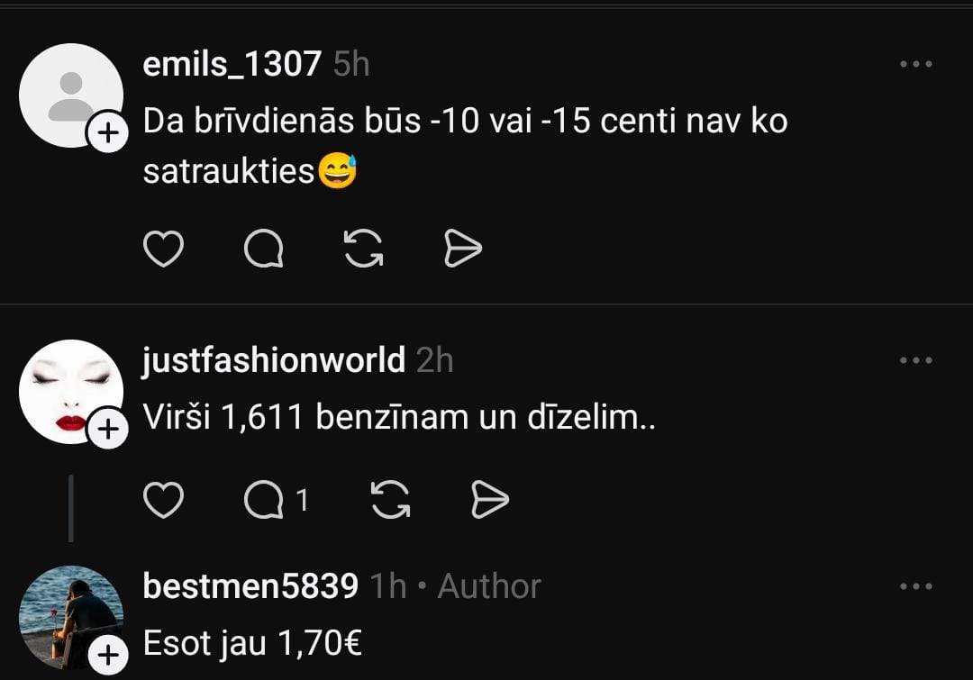 Arī Arnis dalās savās pārdomās: “Pašlaik tas nav saistīts ar notikumiem Irānā, bet ar pieprasījumu – masu psihozi. Visi skrien ieliet degvielu. Cena aug, bet pieprasījums nemazinās. Paaugstinās vēl, kamēr pieprasījums nekritīsies.