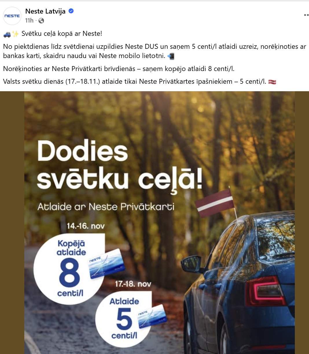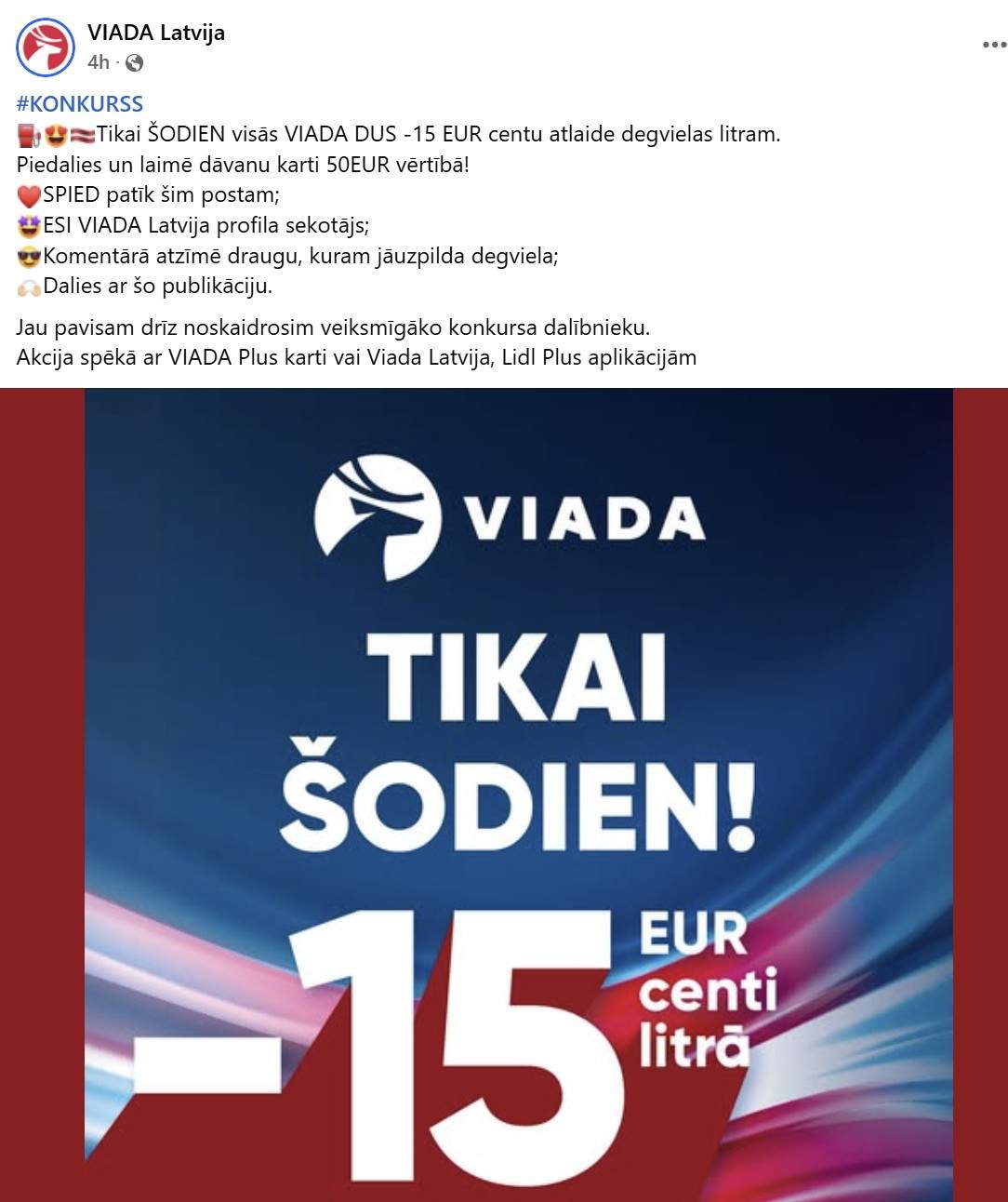 “Viada” plašāku publicitāti brīvdienu atlaidēm cenšas panākt, paralēli organizējot konkursu un aicinot sekotājus dalīties ar informāciju par atlaidēm. Arī viņi piedāvā identisku atlaidi – 15 centi litrā.