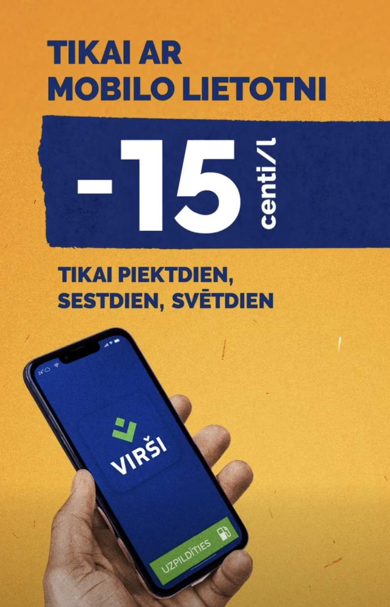 “Virši” reklamē to pašu 15 centu atlaidi litrā, taču tā pieejama, norēķinoties ar mobilo lietotni.