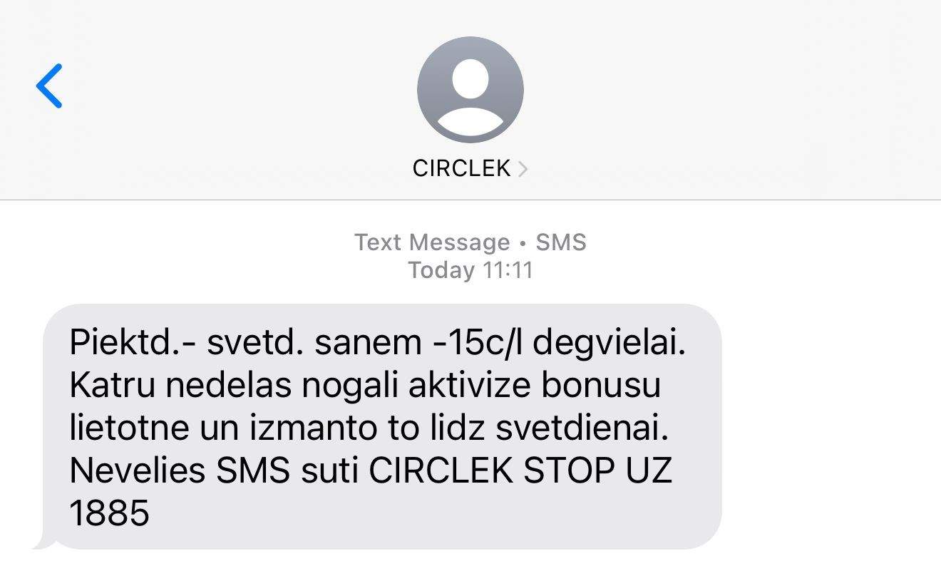 Degvielas uzpildes stacijas “Cicle K” pagaidām sociālajos medijos “klusē”, taču saviem klientiem izsūtīja īsziņas, kurās norāda, ka piektdien un sestdien iespējams saņemt 15 centu atlaidi katram degvielas litram.