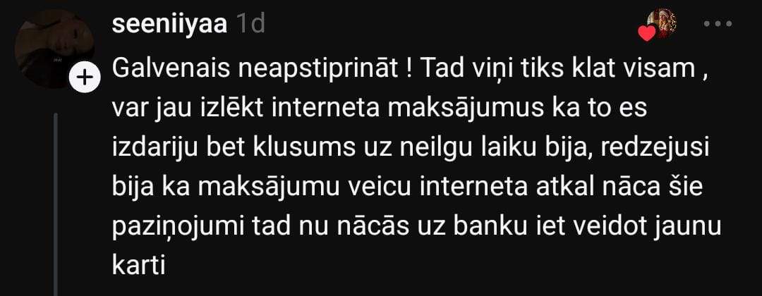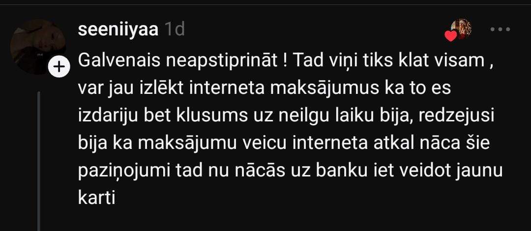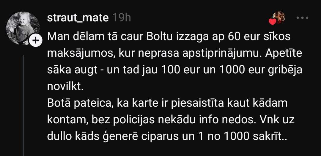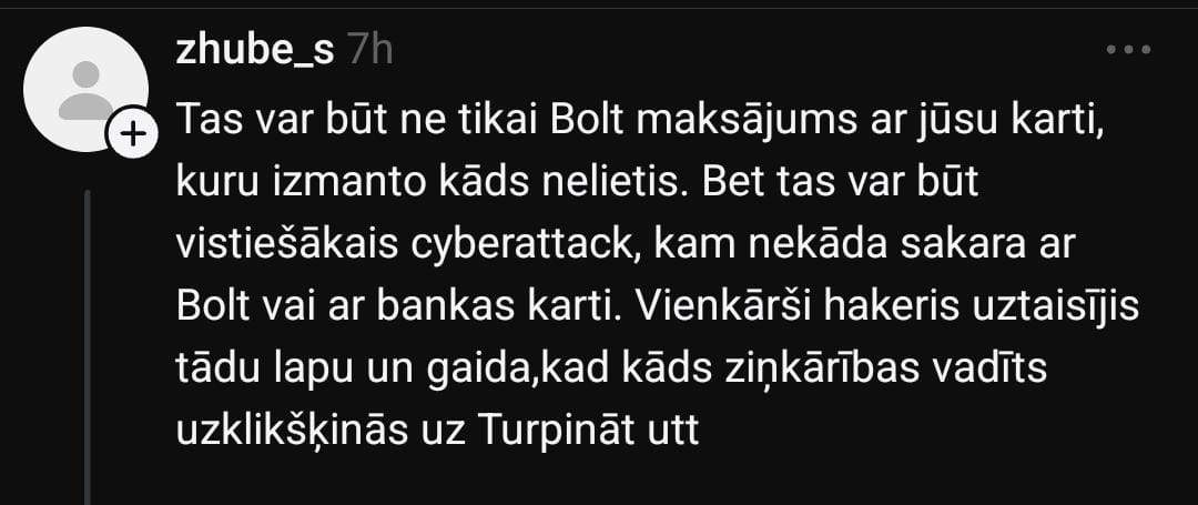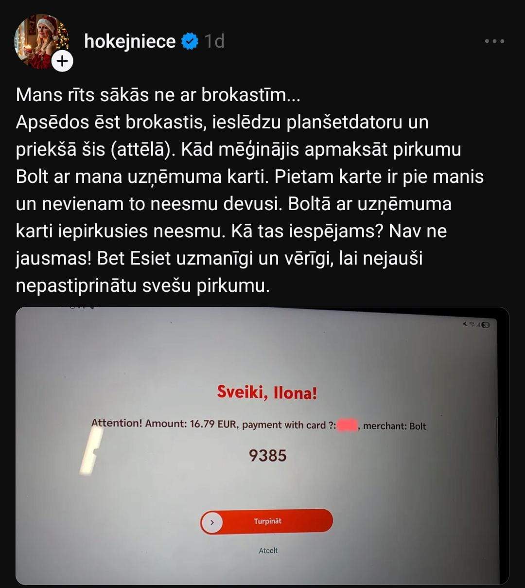 “Mans rīts sākās ne ar brokastīm…Apsēdos ēst brokastis, ieslēdzu planšetdatoru, un priekšā – šis. Kāds mēģinājis apmaksāt pirkumu “Bolt” ar mana uzņēmuma karti. Turklāt karte ir pie manis, un nevienam to neesmu devusi. “Boltā” ar uzņēmuma karti iepirkusies neesmu. Kā tas iespējams? Nav ne jausmas! Bet esiet uzmanīgi un vērīgi, lai nejauši neapstiprinātu svešu pirkumu.”