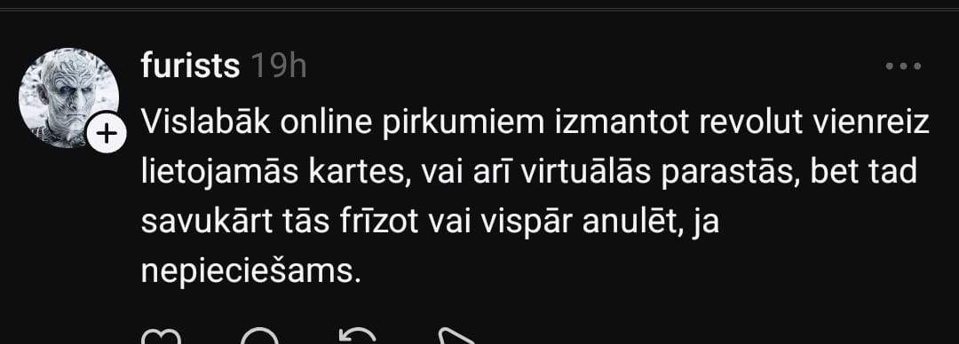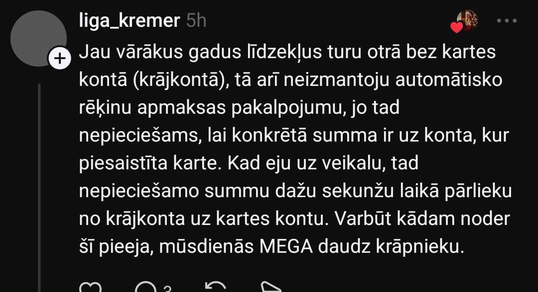 “Tā kā tagad daudzām bankas kartēm vārds, uzvārds, numuri un CVV ir vienā pusē, krāpniekam pietiek uzlikt mazu kameru virs norēķinu termināļa, stāvot rindā filmēt palēninājuma video un uz mirkli ieraudzīt jūsu kartes datus, lai vēlāk mēģinātu norēķināties internetā,” raksta Ivars.