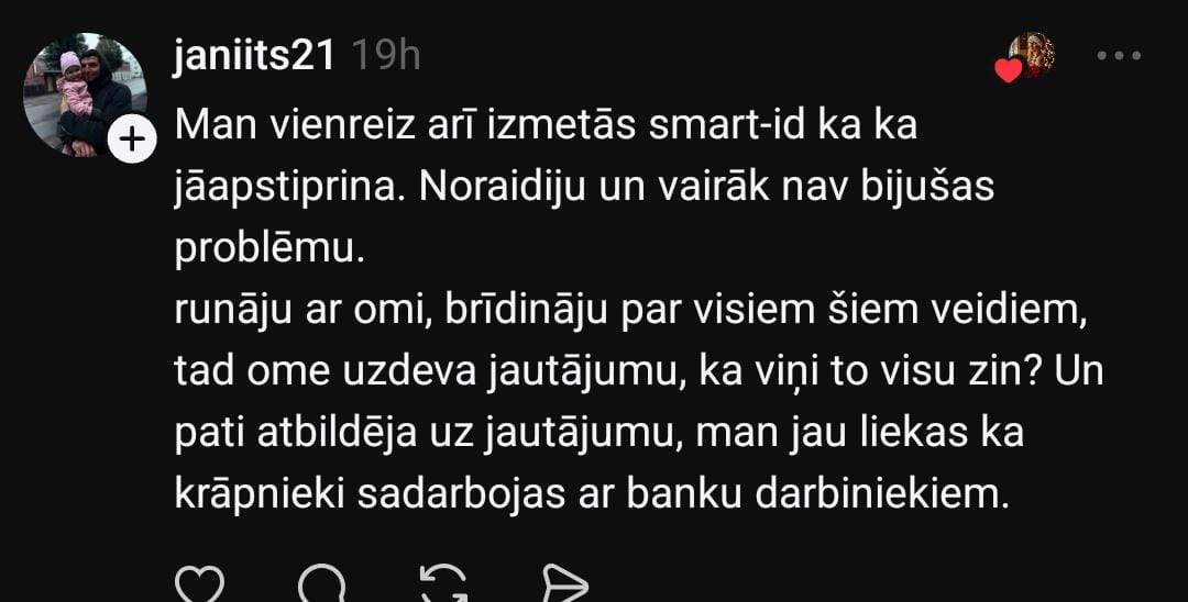 Arī Emīlijai gadījies līdzīgi: “Situācija sekojoša. Vienu rītu pamodos ap 9.00 un telefonā ieraudzīju paziņojumu no “Swedbank”, kas bija atnācis 6.23, ka no manas kartes veikts darījums “Bolt Taxi” Igaunijā. Divas reizes attiecīgās summas bija mazliet virs 16 eiro. Es zvanīju “Swedbank”, pieprasot bloķēt karti, jo man nekad nav bijis “Bolt” konts, nekad neesmu izmantojusi nevienu “Bolt” pakalpojumu, un tajā brīdī es nemaz nebiju Igaunijā. Rezultātā “Swedbank” bloķēja karti un atgrieza naudu.”