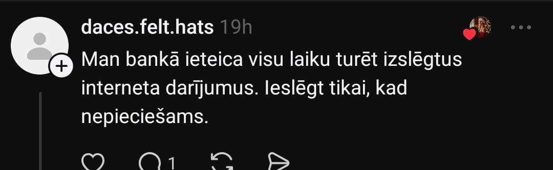 “Iesaku uztaisīt otru “Swedbank” kontu, kuram nav fiziskas kartes. Visu naudu turiet otrajā kontā, bet primārajā — tikai nelielu summu ikdienas pirkumiem. Periodiski pārskaitiet no otrā uz pirmo kontu. Un ar to rezerves kontu neveiciet darījumus internetā.”