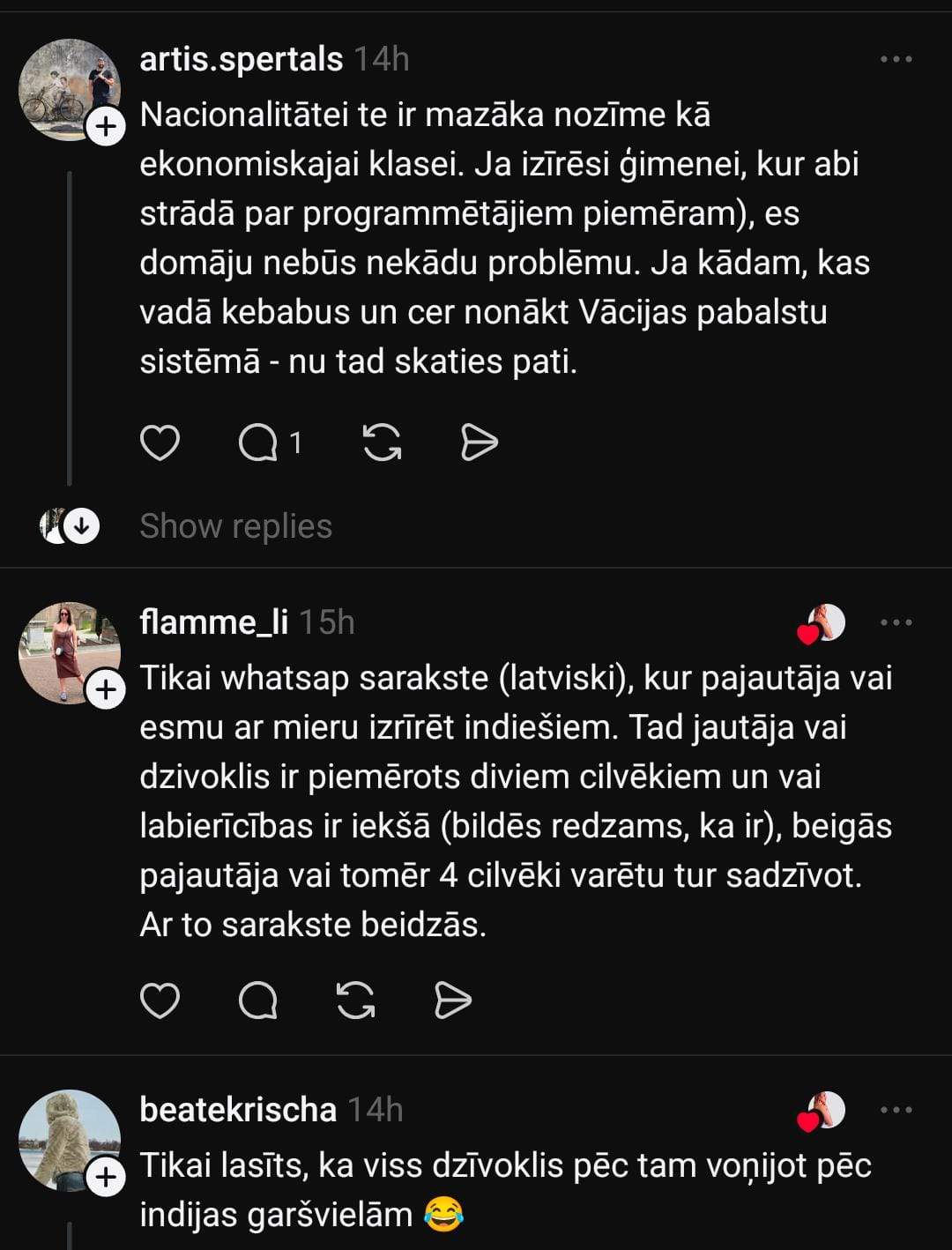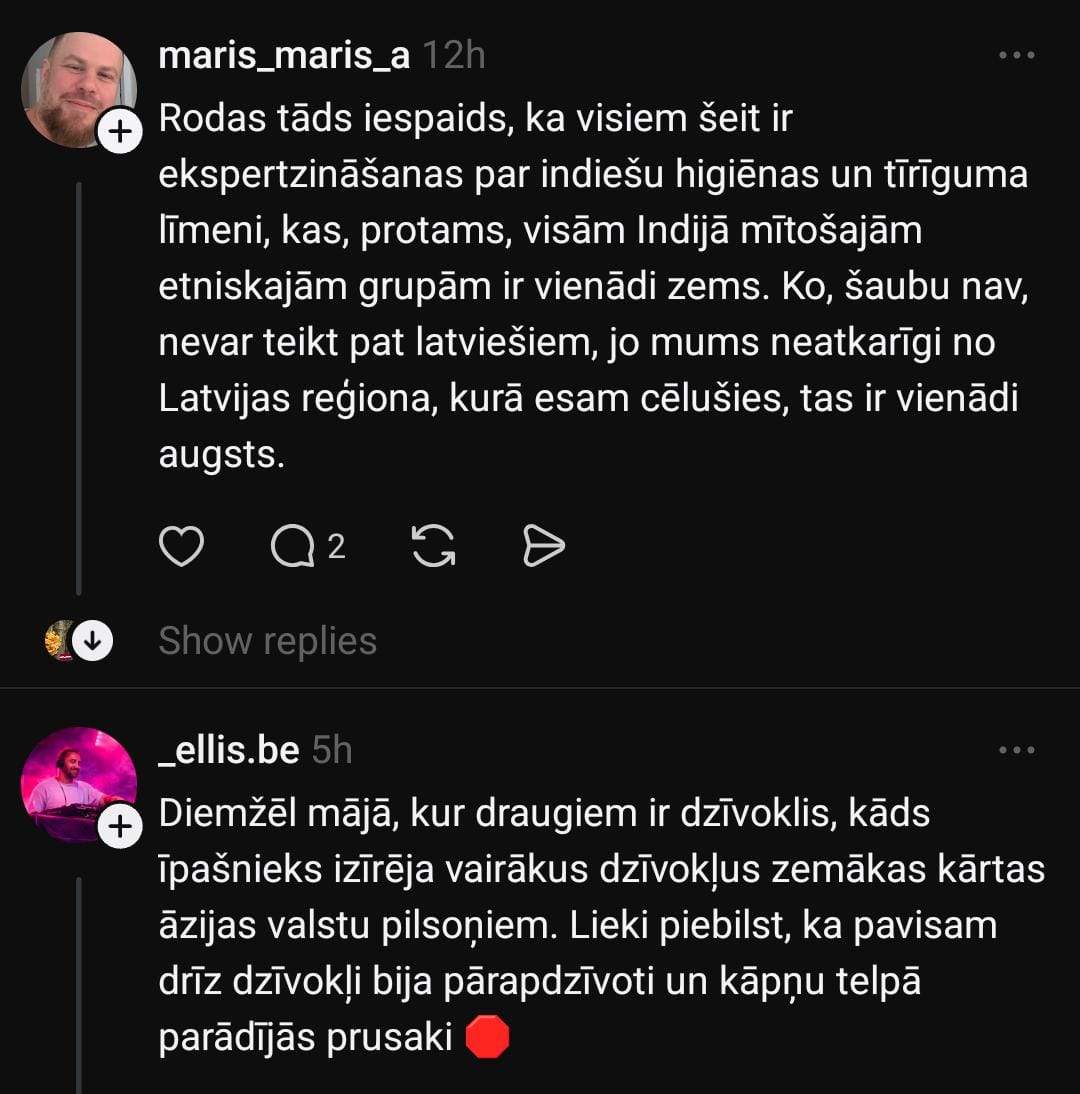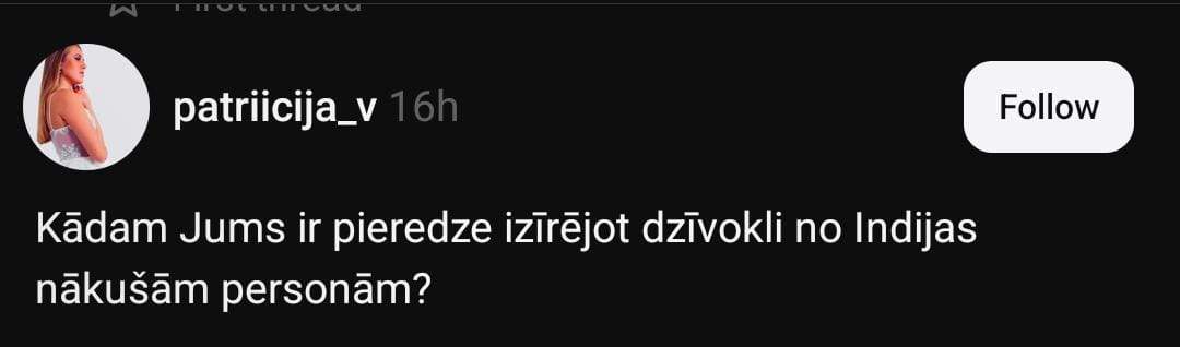 Patrīcija sociālo mediju platformā “Threads” jautā: “Vai kādam no jums ir pieredze, izīrējot dzīvokli no Indijas nākušām personām?”