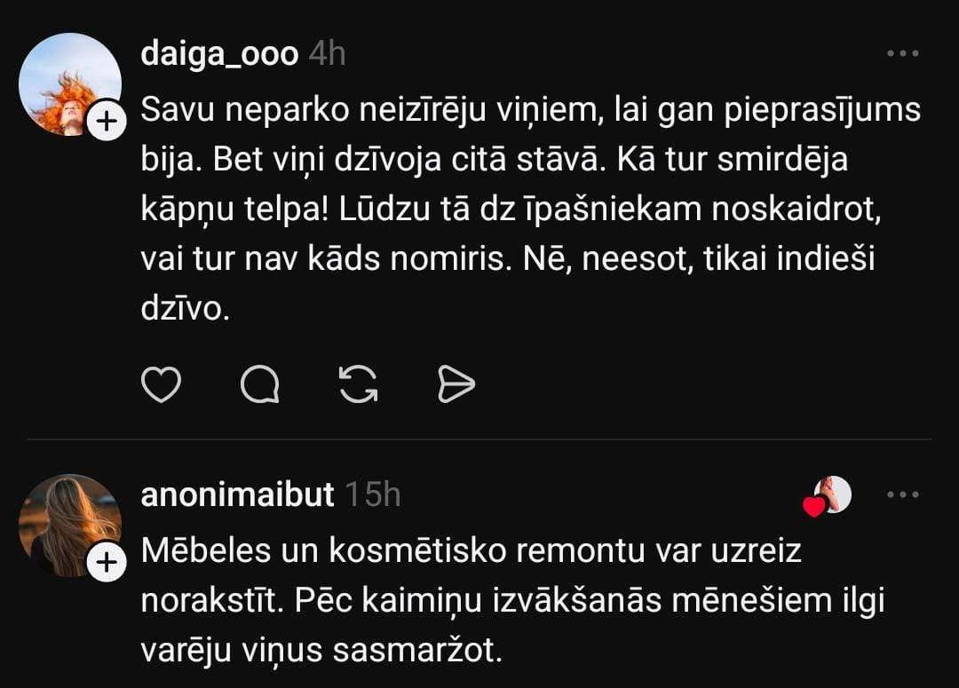 Vairāki lietotāji norāda, ka nācies sadzīvot ar īpatnēju smaku: “Mēbeles un kosmētisko remontu var uzreiz norakstīt. Pēc kaimiņu izvākšanās mēnešiem ilgi varēju viņus “sasmaržot”.”
