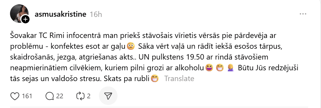 “Sāka vērt vaļā un rādīt iekšā esošos tārpus, skaidrošanās, jezga, atgriešanas akts.. UN pulkstenis 19.50 ar rindā stāvošiem neapmierinātiem cilvēkiem, kuriem pilni grozi ar alkoholu. Būtu Jūs redzējuši tās sejas un valdošo stresu. Skats pa rubli,” raksta sieviete.