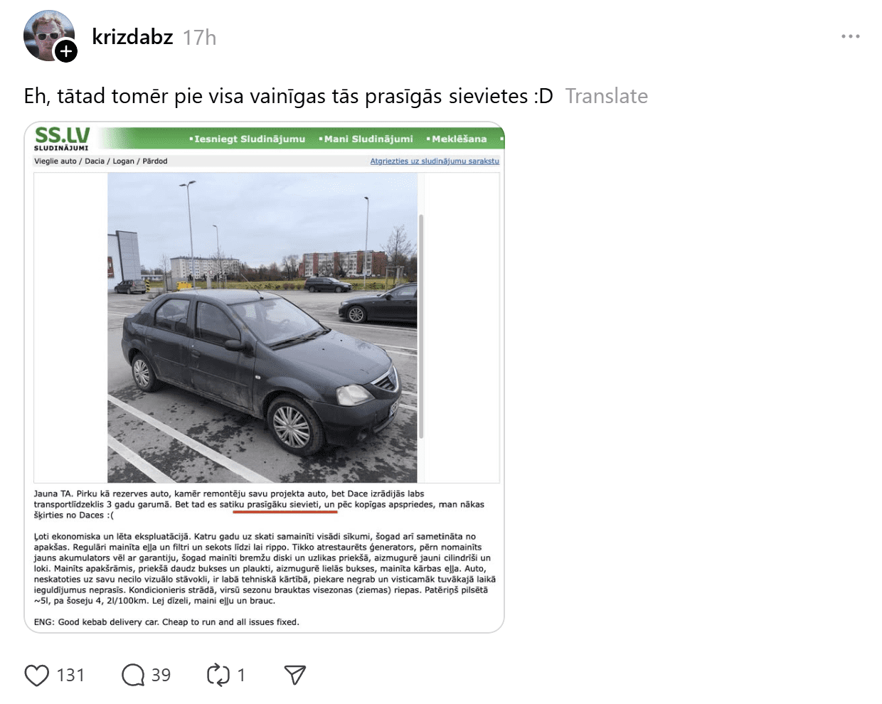 “Čalis ir ceļā uz smagu ieberzienu….” Sludinājumā minētais šķiršanās iemesls no uzticamās “Dacītes” sasmīdina tautu 0