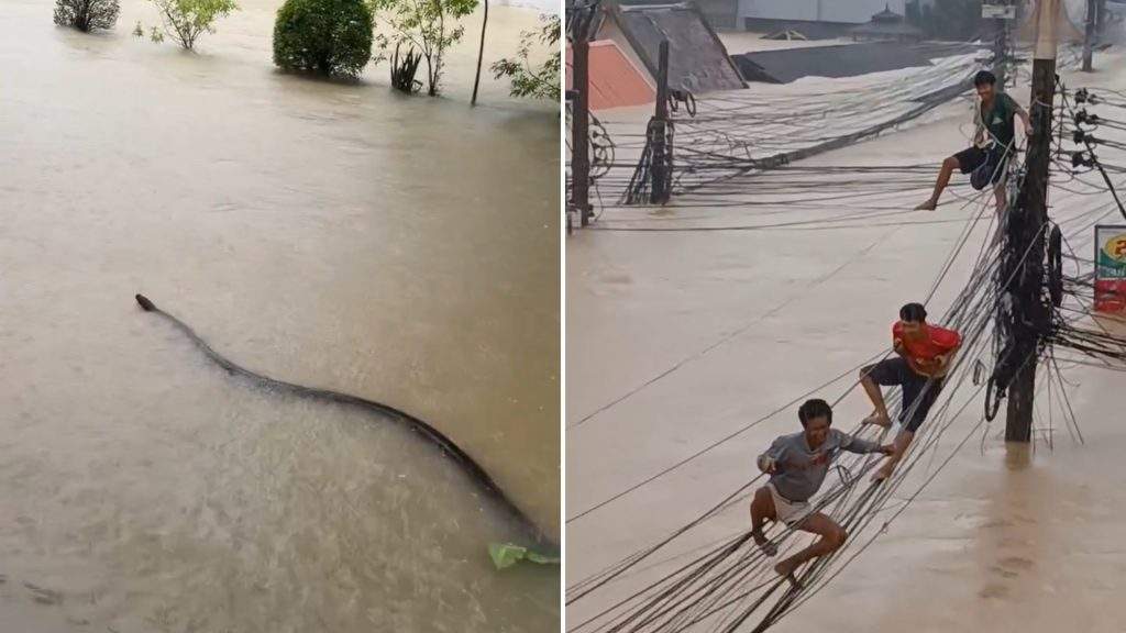 VIDEO. Milzu čūska peld pa ceļu, cilvēki spiesti rāpties pa vadiem… Taizemi pārņēmuši postoši plūdi